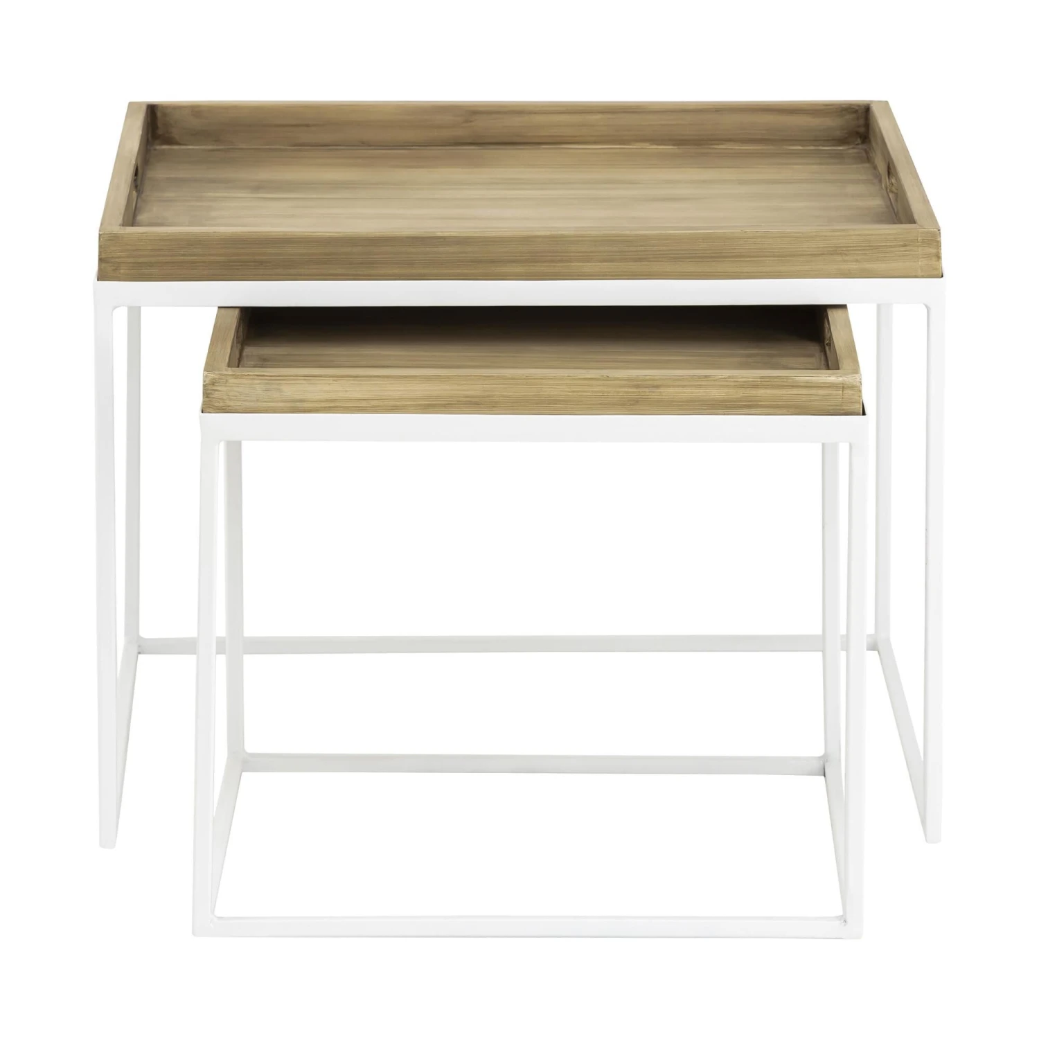The Akin Accent Tables feature an open, metal frame base, allowing the smaller of the two to be neatly nested under the larger one when not in use. The wood tray table tops on these pieces provide handles for ease of movement while the raised sides help keep items secure. The Akin tables are ideal for presenting food or beverages or providing a useful spot for keeping phones and keys in a hallway. This item comes in brushed steel and natural wood finish.