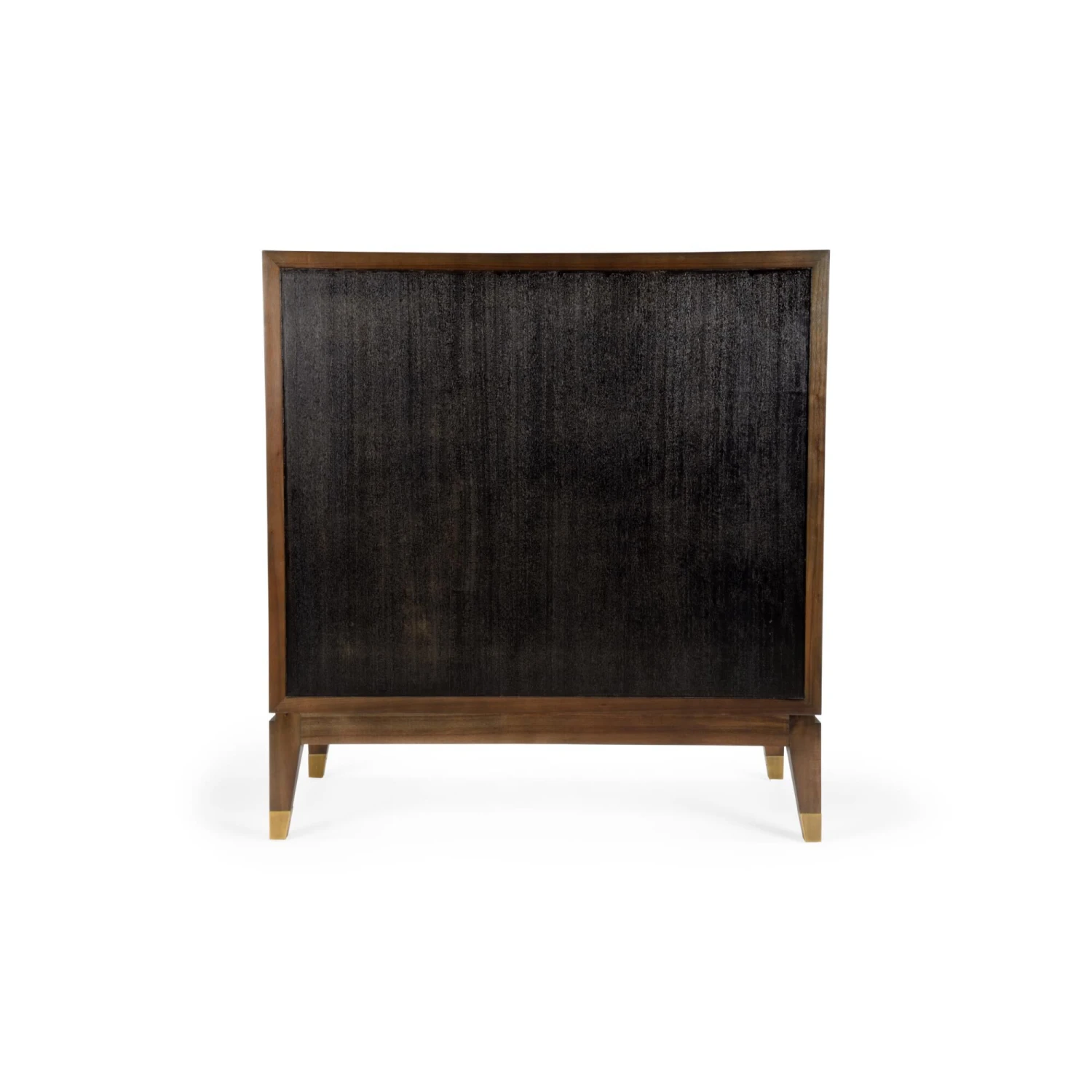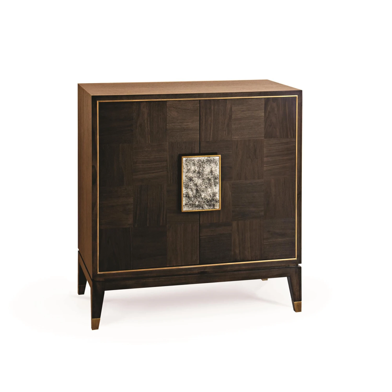 Accented By Brass Trim Doors And Feet, This Two Door Cabinet With A Checkerboard Pattern In Varied Walnut Features A Large Square Antique Mirror And A Tapered Leg Base. Not Intended For Clothing Storage.
