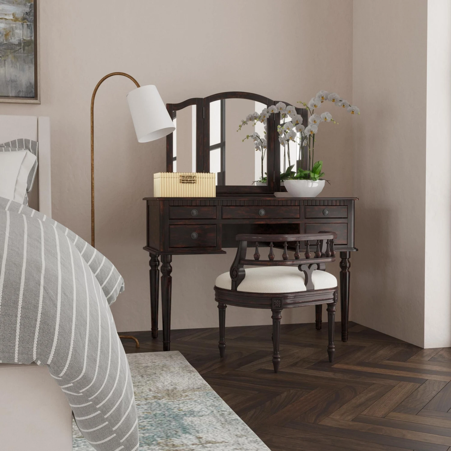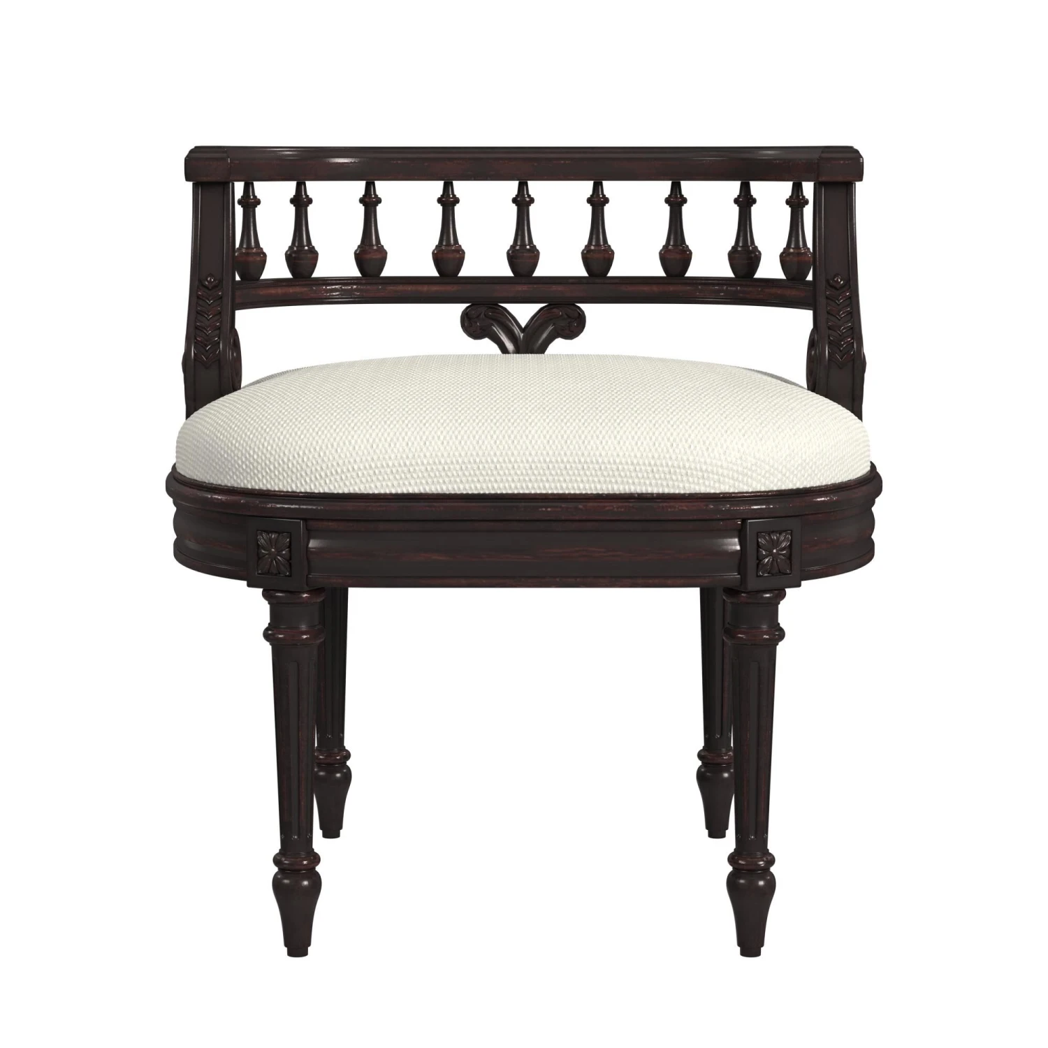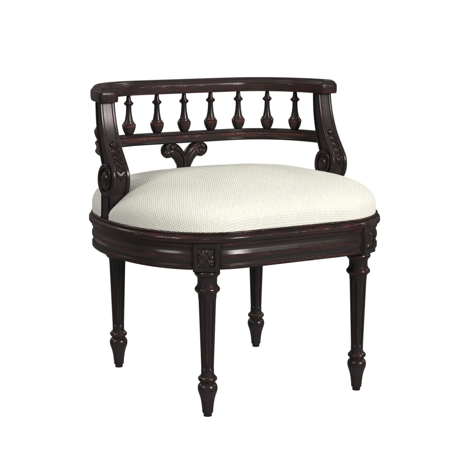This Elegant Hand Painted Vanity Seat Adds Formal Elegance To Any Powder Or Dressing Room. Hand Crafted From Poplar Hardwood Solids And Wood Products, It Features A Carved Solid Wood Back And Legs. The Generously-Sized, Upholstered Seat Cushion Is Covered In An Ivory Cotton Hobnail Fabric. Fixture Dimension: 22 W, 17 D, 24 H WARNING: This product can expose you to chemicals including Chlorinated Tris (TDCPP), which are known to the State of California to cause cancer or birth defects or other reproductive harm. For more information go to www.P65Warnings.ca.gov/furniture