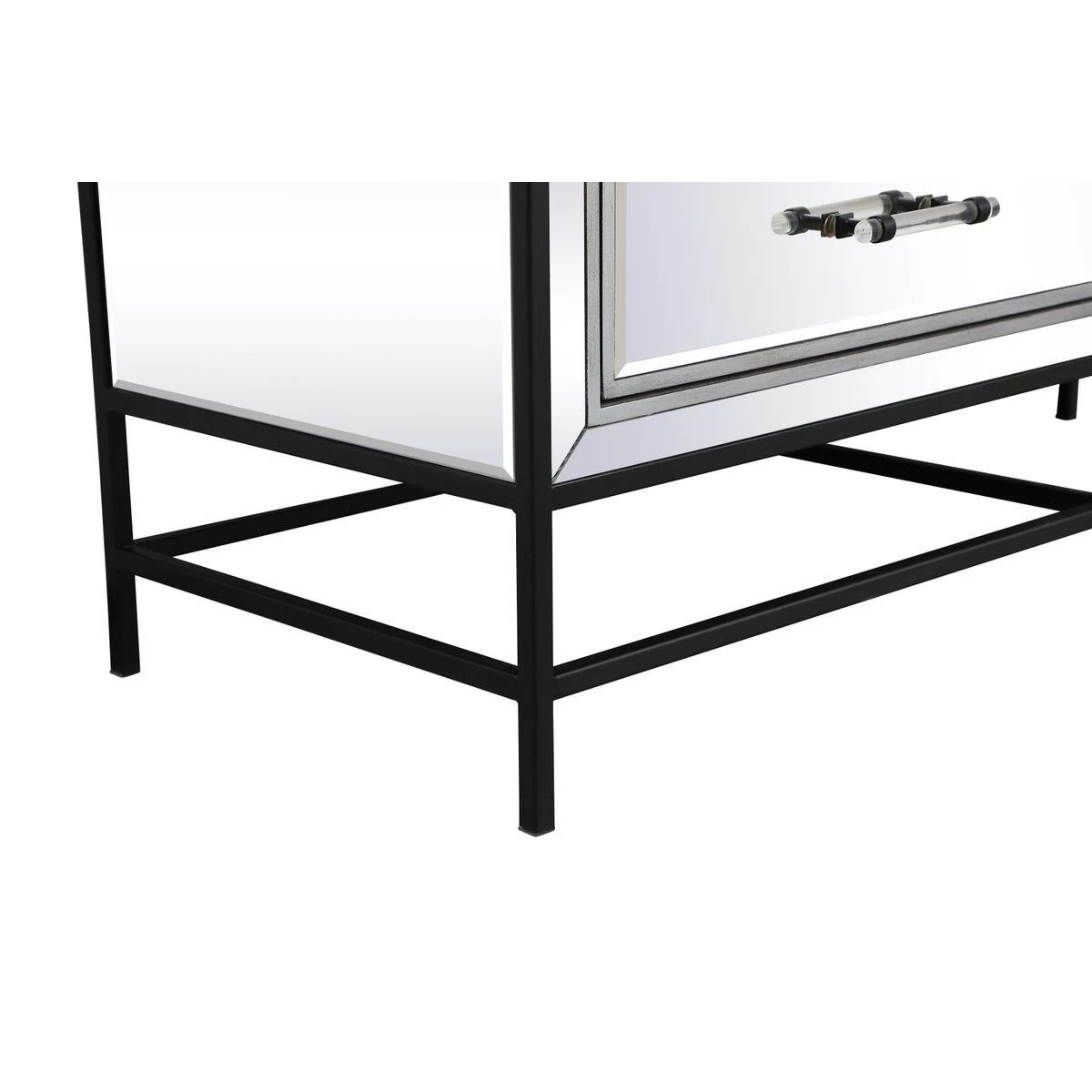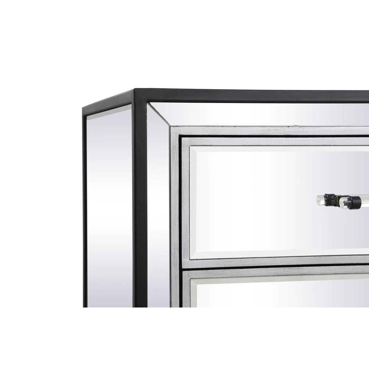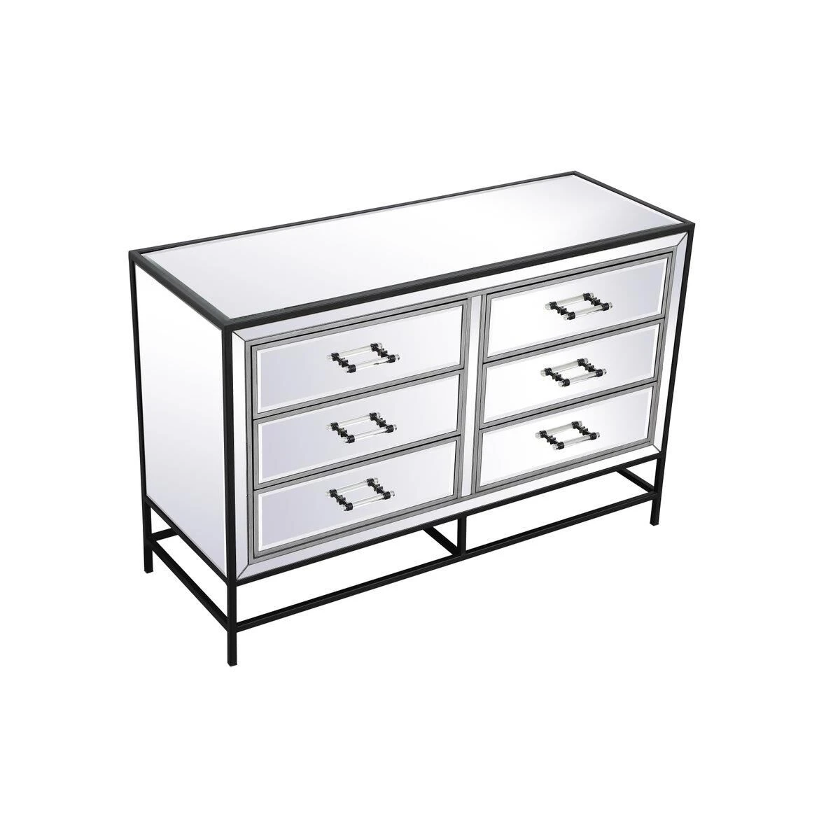 The Beau collection mirrored furniture in a black finish will add lovely sophistication and complement any living room or bedroom area, while utilizing its charm and function to provide you with ample storage spaces. Clear acrylic handle gently adorn the mirrored panel and contrasting black metal legs, allowing for you to store away your essentials.
