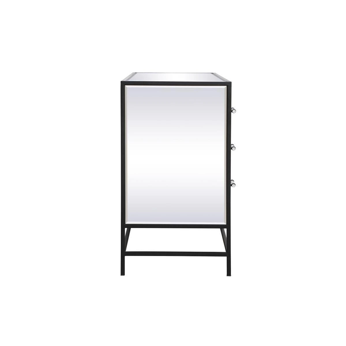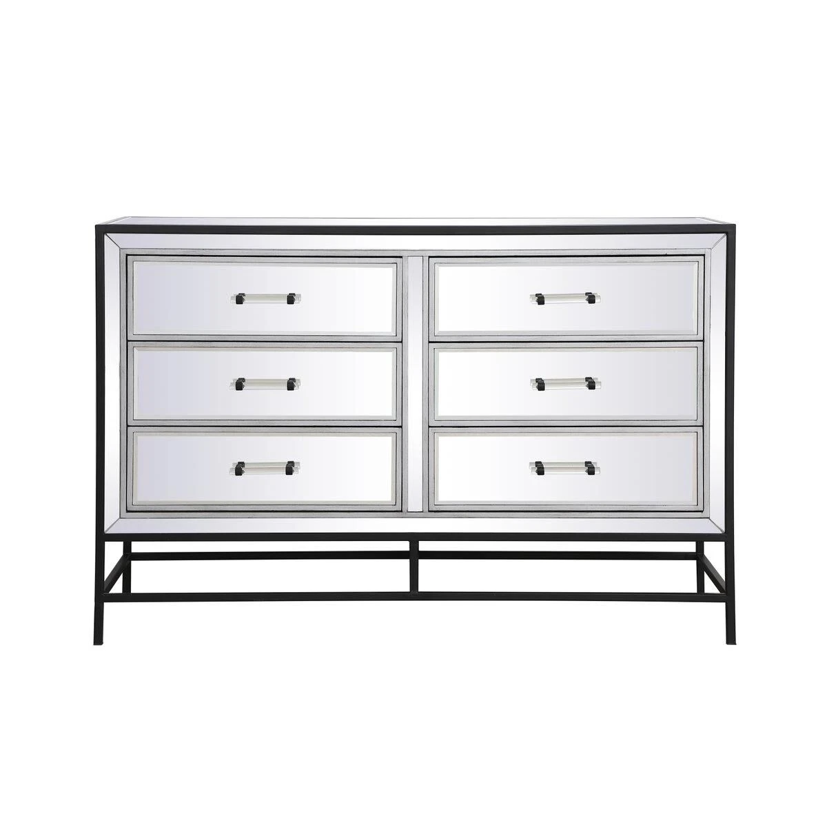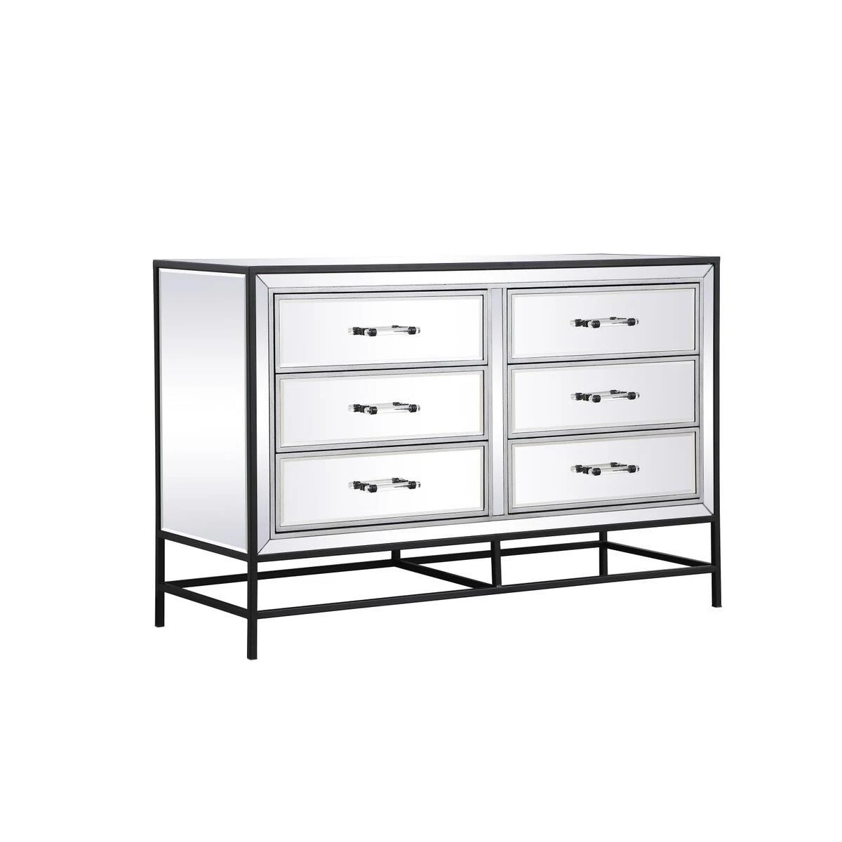 The Beau collection mirrored furniture in a black finish will add lovely sophistication and complement any living room or bedroom area, while utilizing its charm and function to provide you with ample storage spaces. Clear acrylic handle gently adorn the mirrored panel and contrasting black metal legs, allowing for you to store away your essentials.