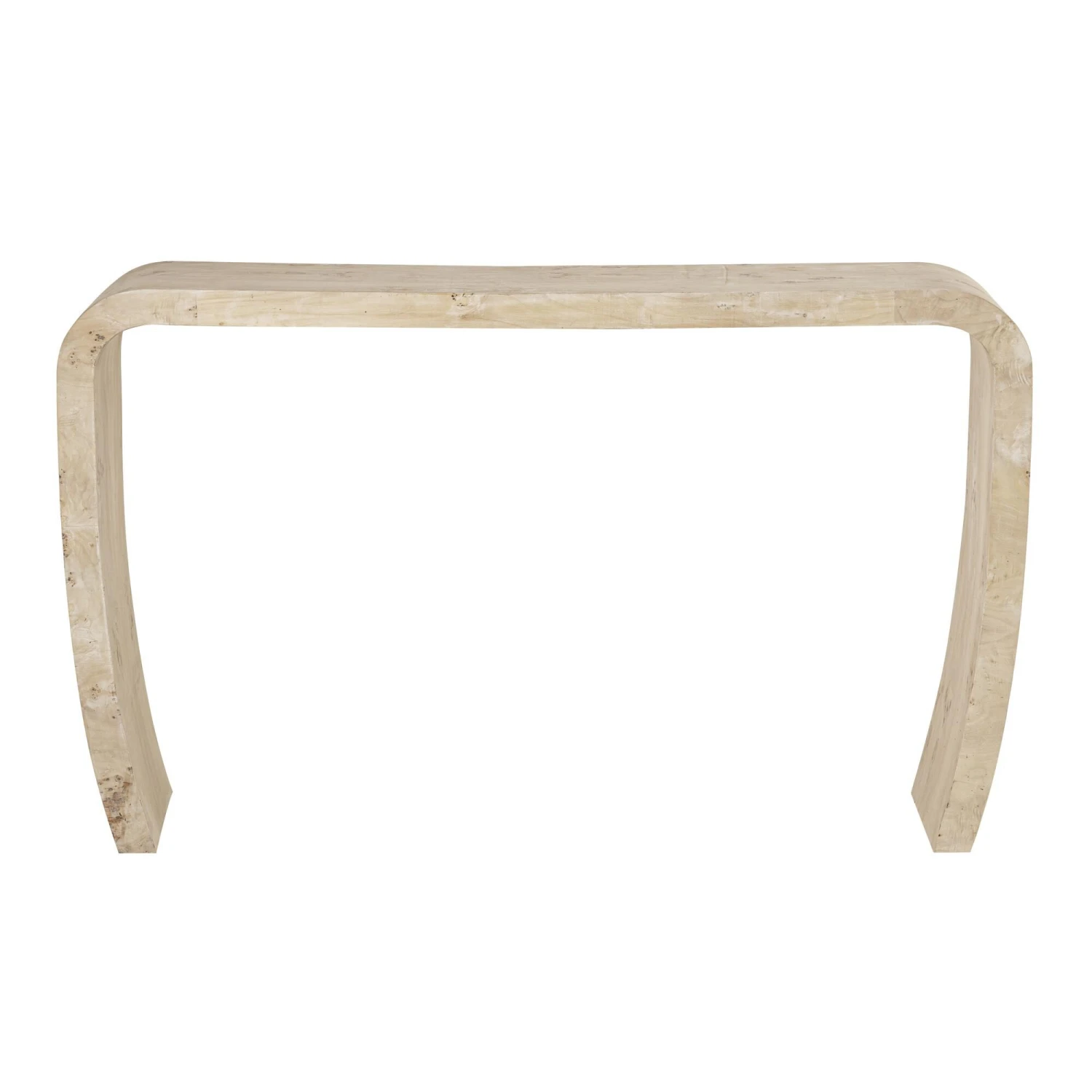 With gentle curves and waterfall sides, the Clip Console Table appears as a single folded strip that lightly tapers at the floor. The sophisticated and versatile white burl finish is an updated take on a classic finish, designed to work in a variety of room types and styles.