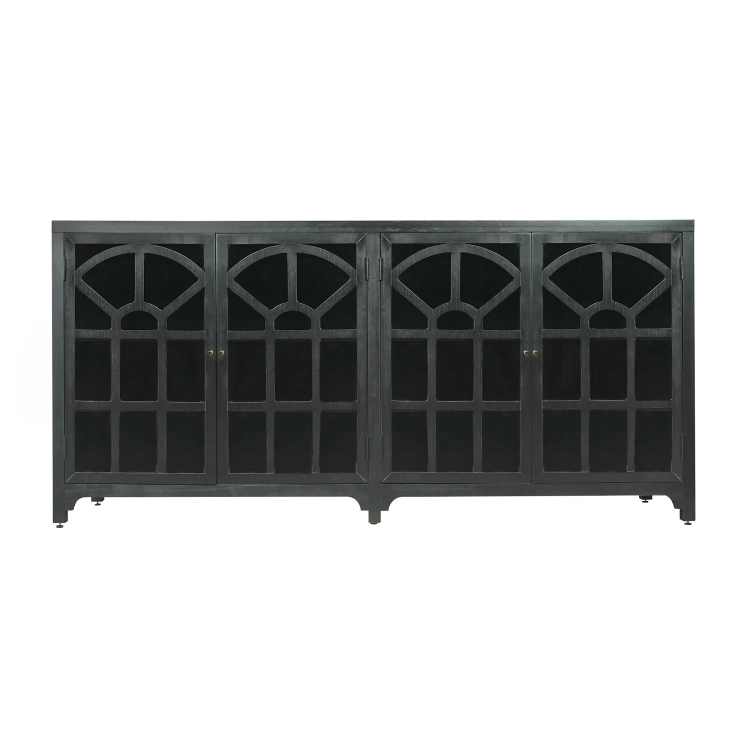 The Conrad Credenza is a four-door wooden storage piece stained matte Kettle Black. Carved arches and glass panels in the doors provide a unique architectural detail, and inner shelves provide endless options for storage.