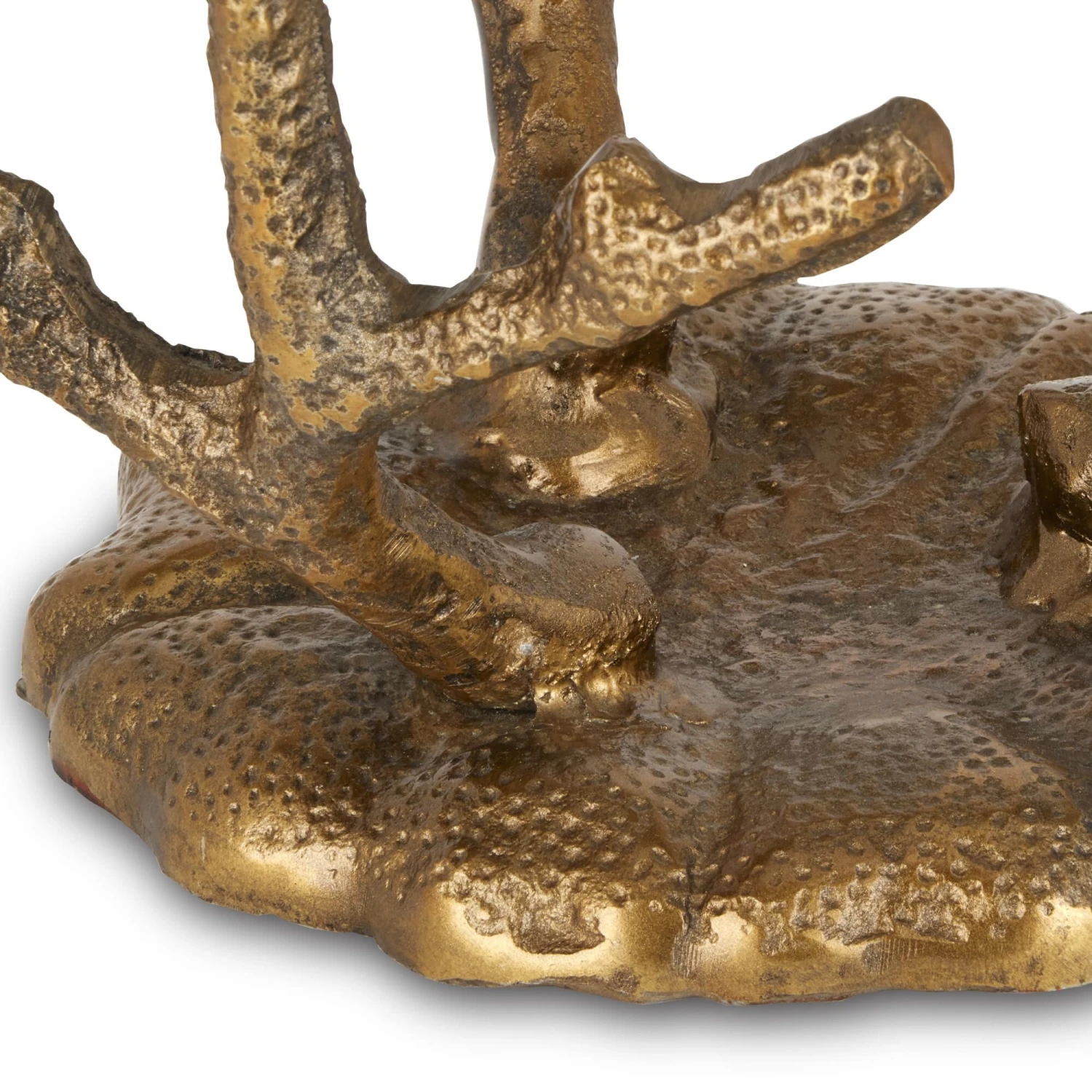 The Coral Accent Table is an artistically rendered version of the flowing and billowing animals that make up the worlds great reefs. The fact that the nubby creation is rendered in a brute material like cast aluminum makes the gold occasional table more of a feat. As is the case with all metals that are poured into molds, the surfaces in an antique brass finish have drifts of pitting and stippling that enhances the table’s patina. The floating clear glass top fits seamlessly into place and is easy to remove for cleaning.