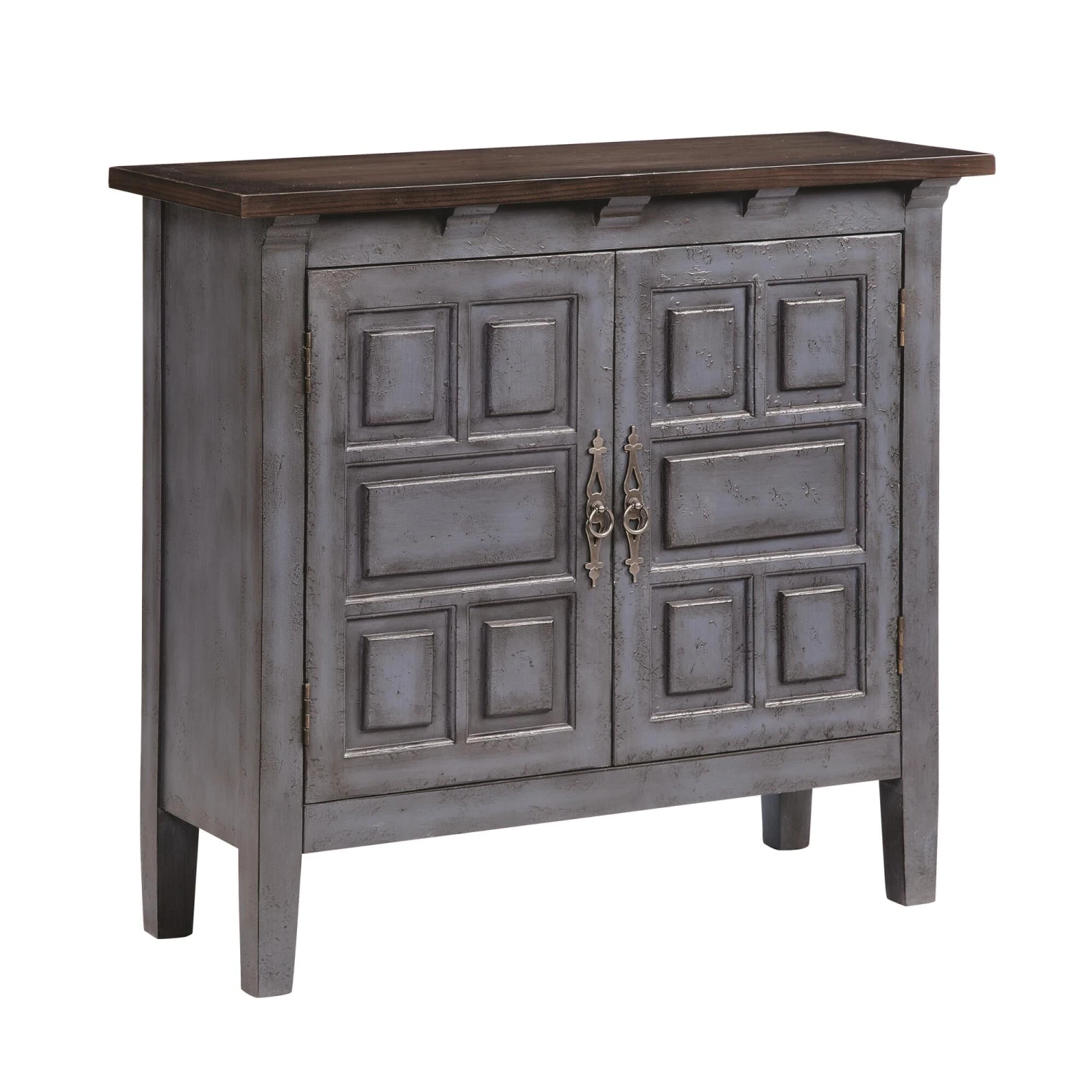 Two-door accent cabinet with one adjustable shelf and wire management on back panel. Hand-painted distressed blue slate finish with dark brown wood-tone top. Raised block panel design on door fronts.