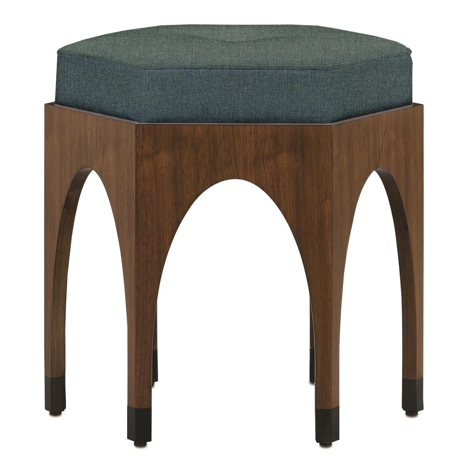 The frame of the Dyer Blue Ink Walnut Ottoman is made of mahogany in a warm walnut finish that brings patina to its arched legs. The simplified cathedral-inspired hexagonal stool has black details on its feet. The upholstered seat of the brown ottoman is shown here in a F0226 Appel Ink Blue fabric. We also offer the Dyer in a oyster gray finish with tan fabric. The Dyer is also available in muslin.