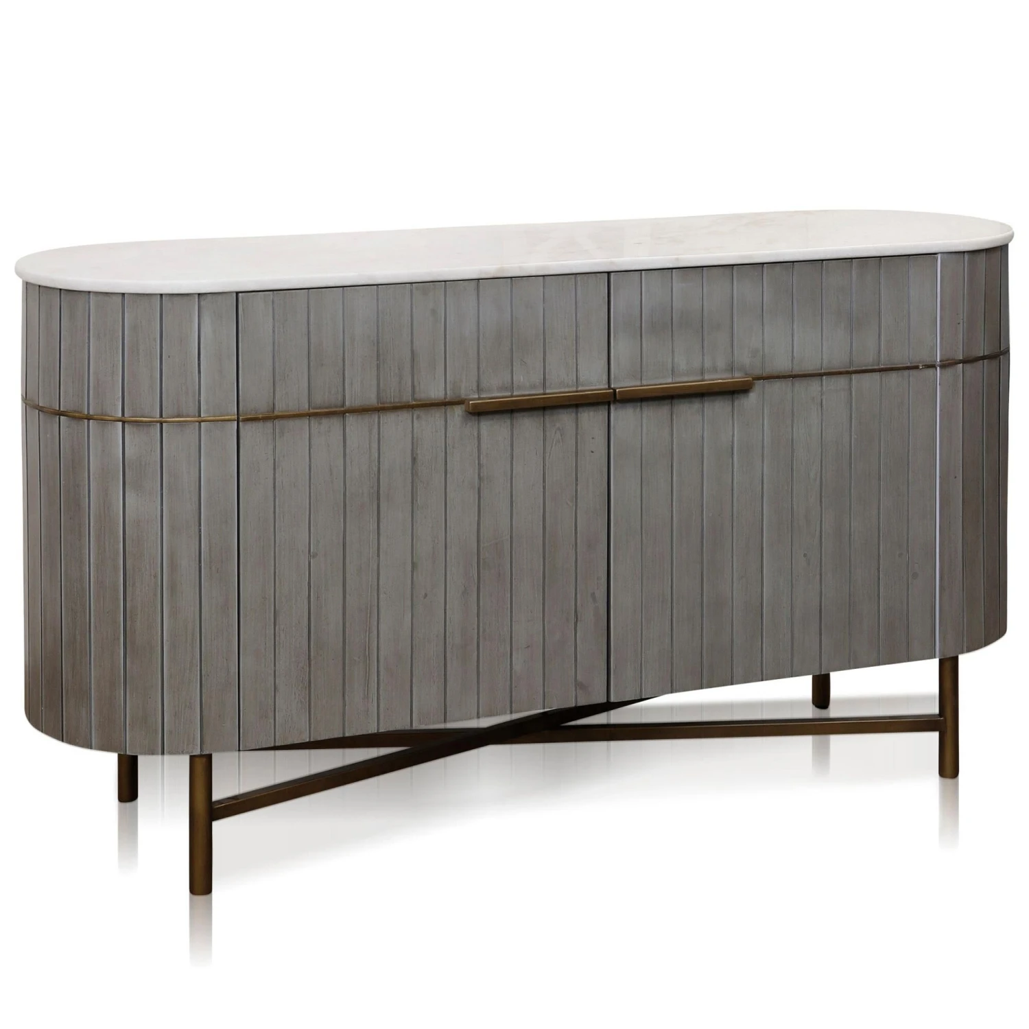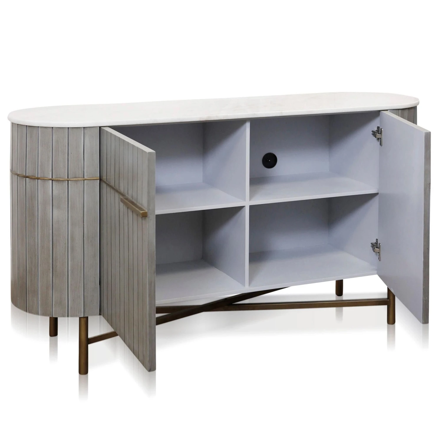 Create an antique inspired look by displaying this grey washed cabinet in your home. This piece is ideal for an entertainment bar for cocktails and spirits, a coffee bar in your kitchen, or simply used for storage of home essentials. This stunning cabinet features a veneer paneling, genuine white marble top, a gold metal base, and gold inlay accents.Features – Due to the production process, each piece is unique and no two are exactly alike.This gorgeous cabinet is perfect for the modern boho inspired home offering additional storage space with a fixed shelf behind each door.Comes to life with the grey washed wood veneer paneling, genuine marble top, gold metal base, and gold accent details.Specification – Location Rating – Dry