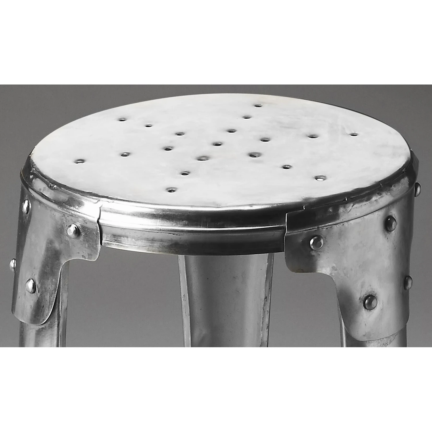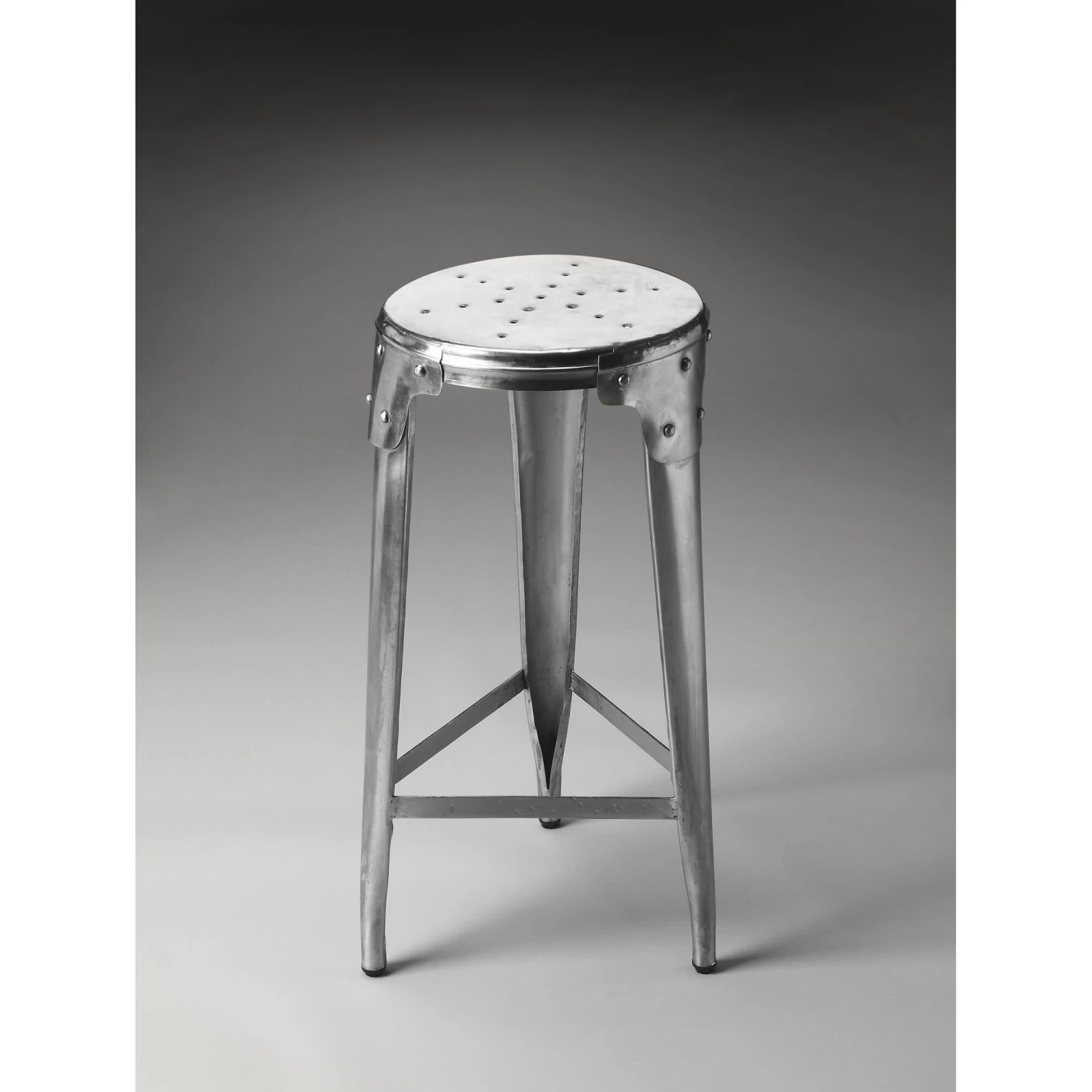 Crafted from hand-forged aluminum in a matte finish with riveted braces uniting round seat and tapered legs, this Bar Stool sits comfortably in a vintage industrial zone. Fixture Dimensions: 12 W, 12 D, 28 H WARNING: This product can expose you to chemicals including Nickel compounds, which are known to the State of California to cause cancer or birth defects or other reproductive harm. For more information go to www.P65Warnings.ca.gov/furniture