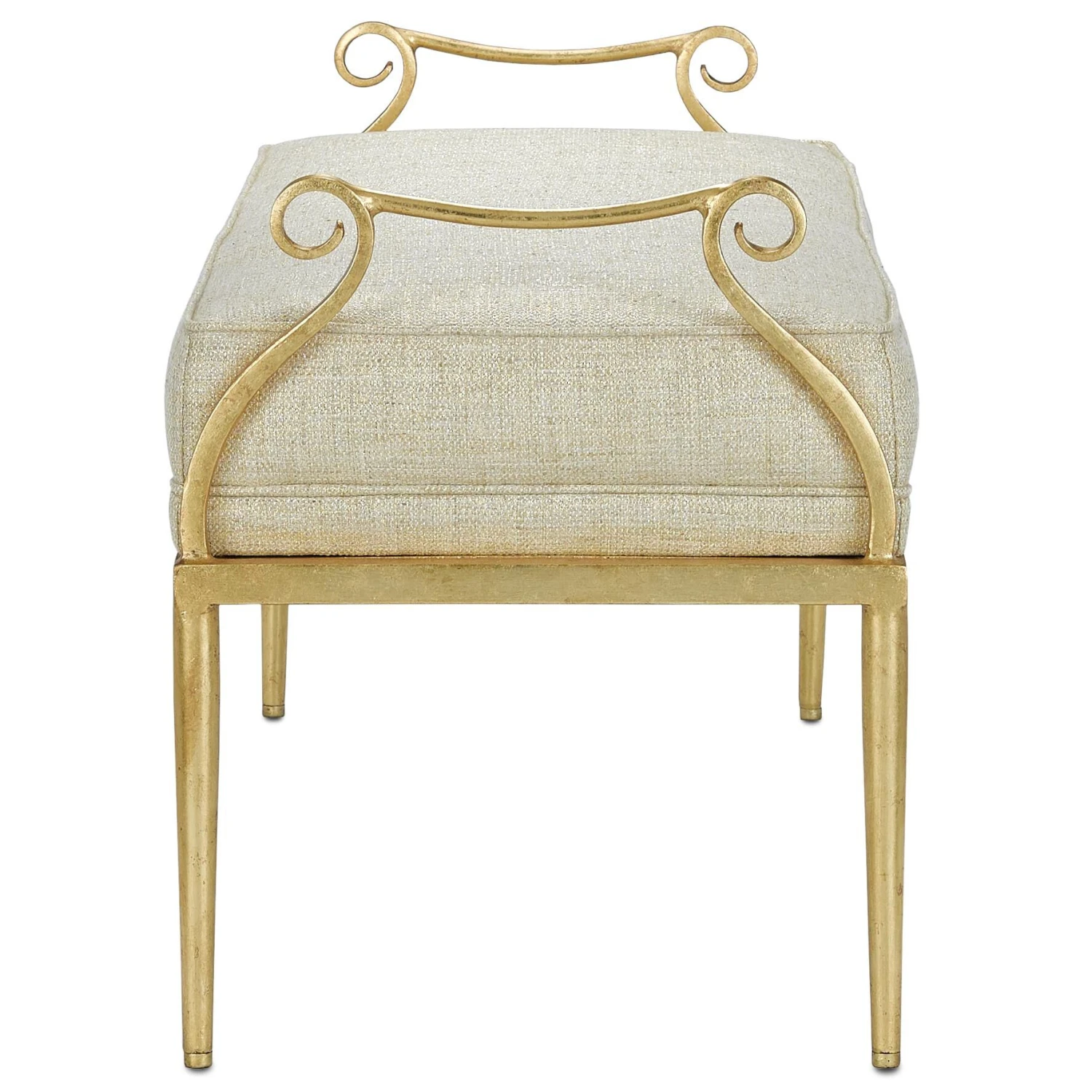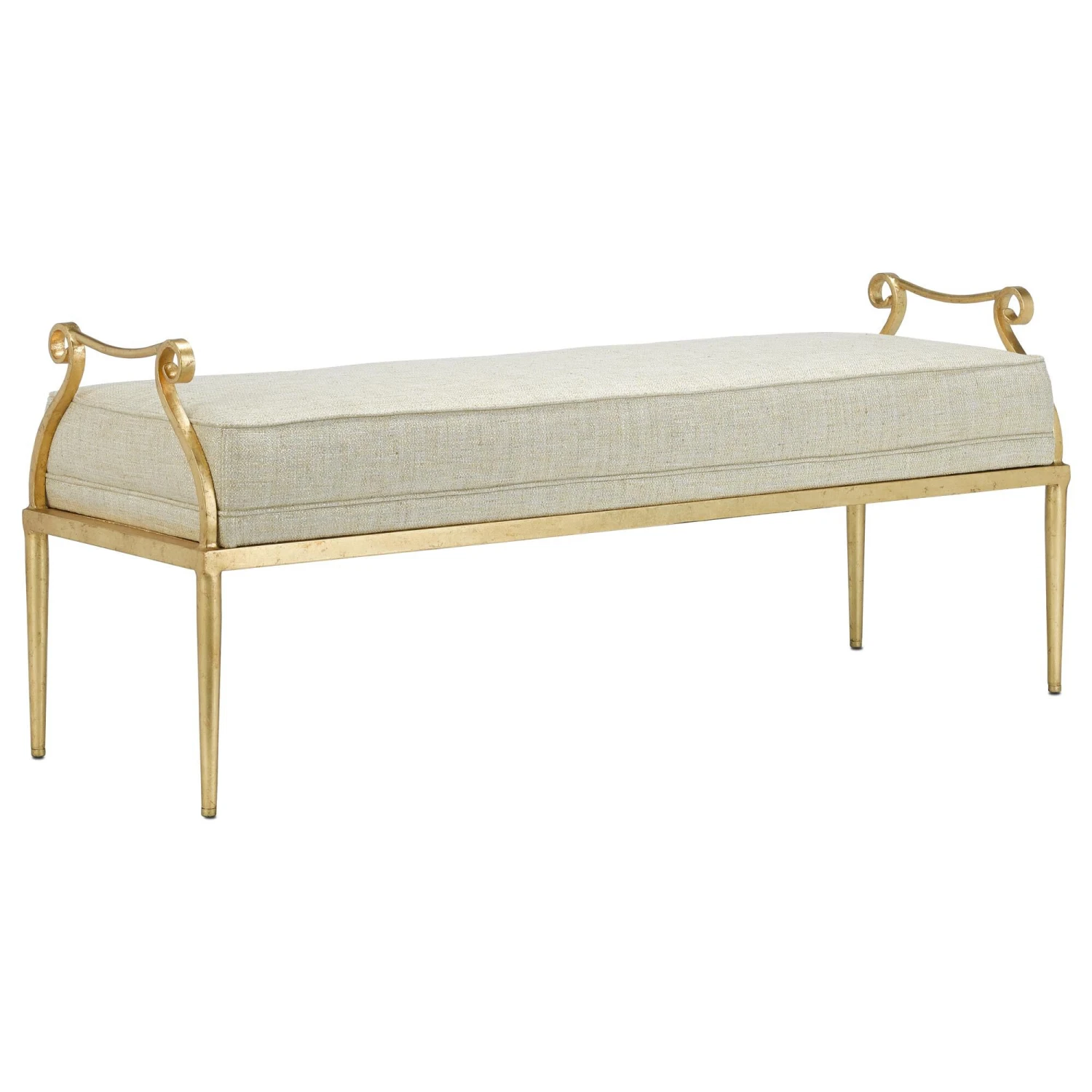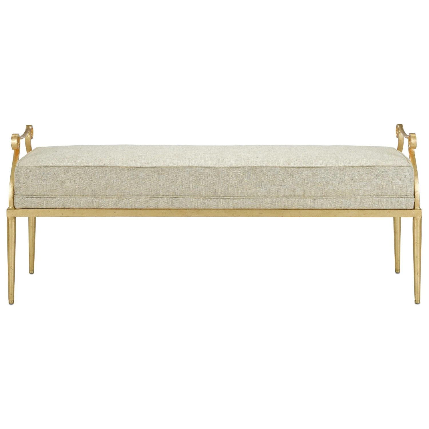 The frame of the Genevieve Shimmer Gold Bench is finished in rich Grecian gold that illuminates its legs and distinctive side flourishes reminiscent of Egyptian hieroglyphic symbology. The upholstered seat of the Genevieve is shown here in a Sequin Gold Dust fabric, which is made of 100-percent polyester. We also offer the Genevieve Shimmer Gold in an ottoman and in an ottoman and bench in Spa Silver upholstery. Cleaning code: S. Also available in muslin.