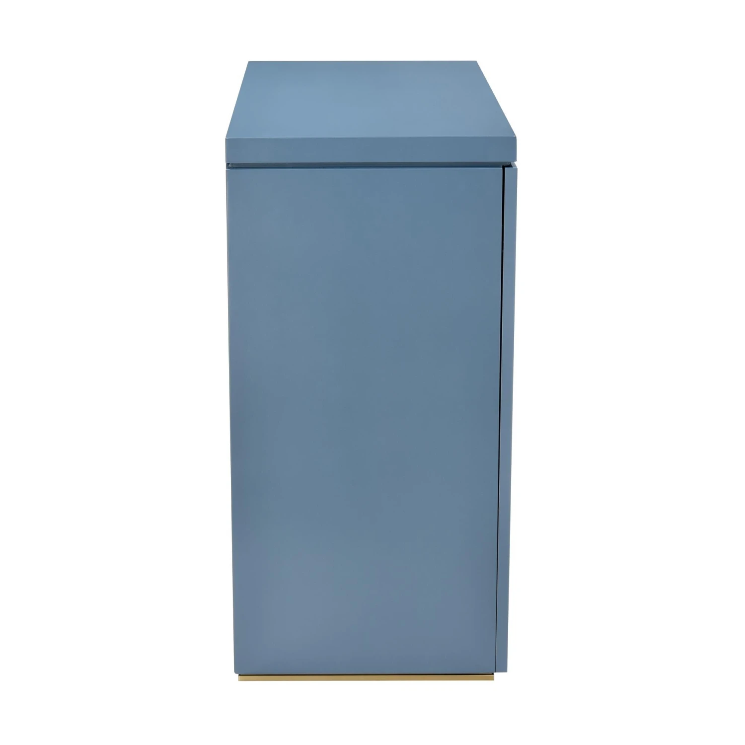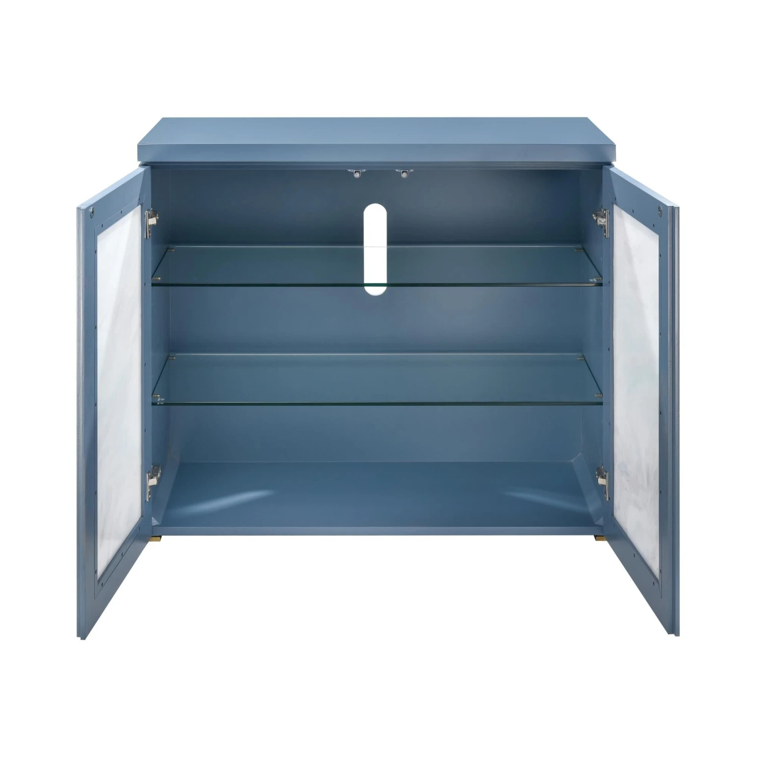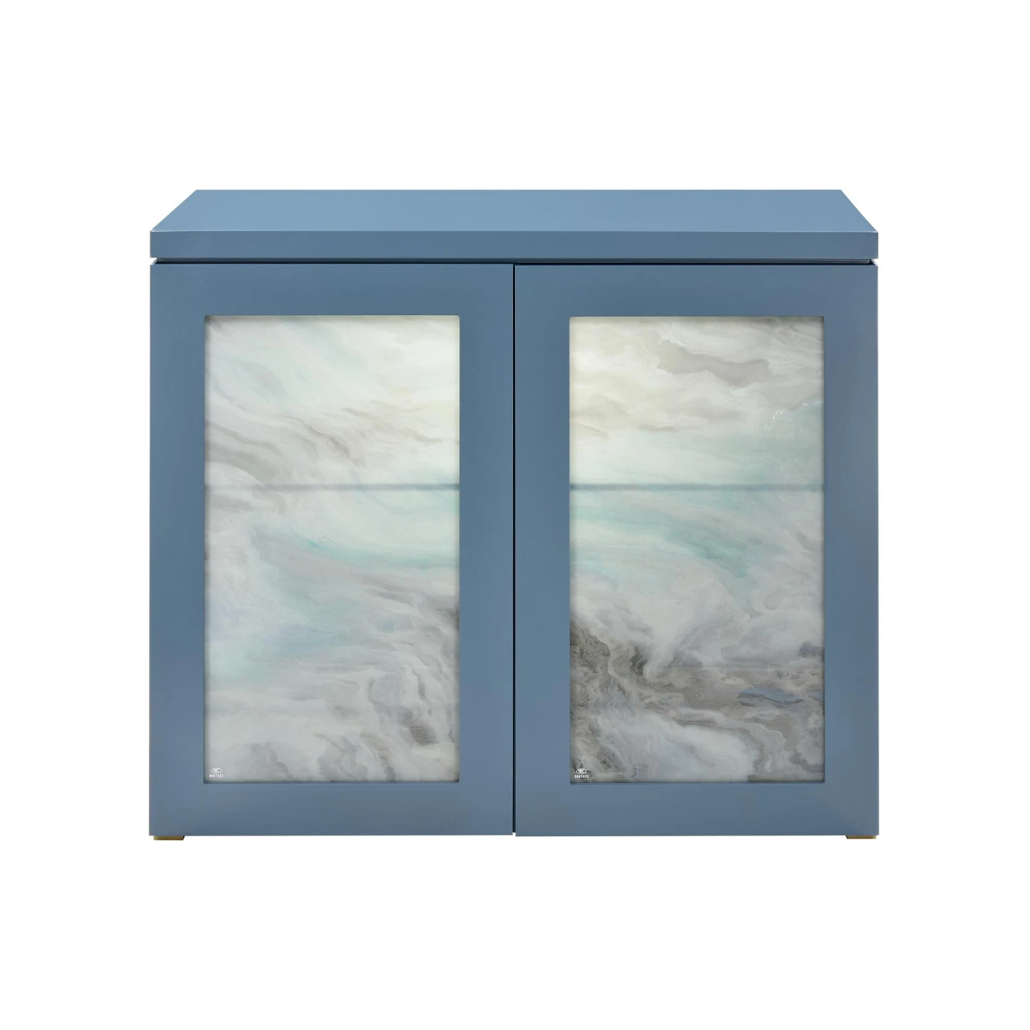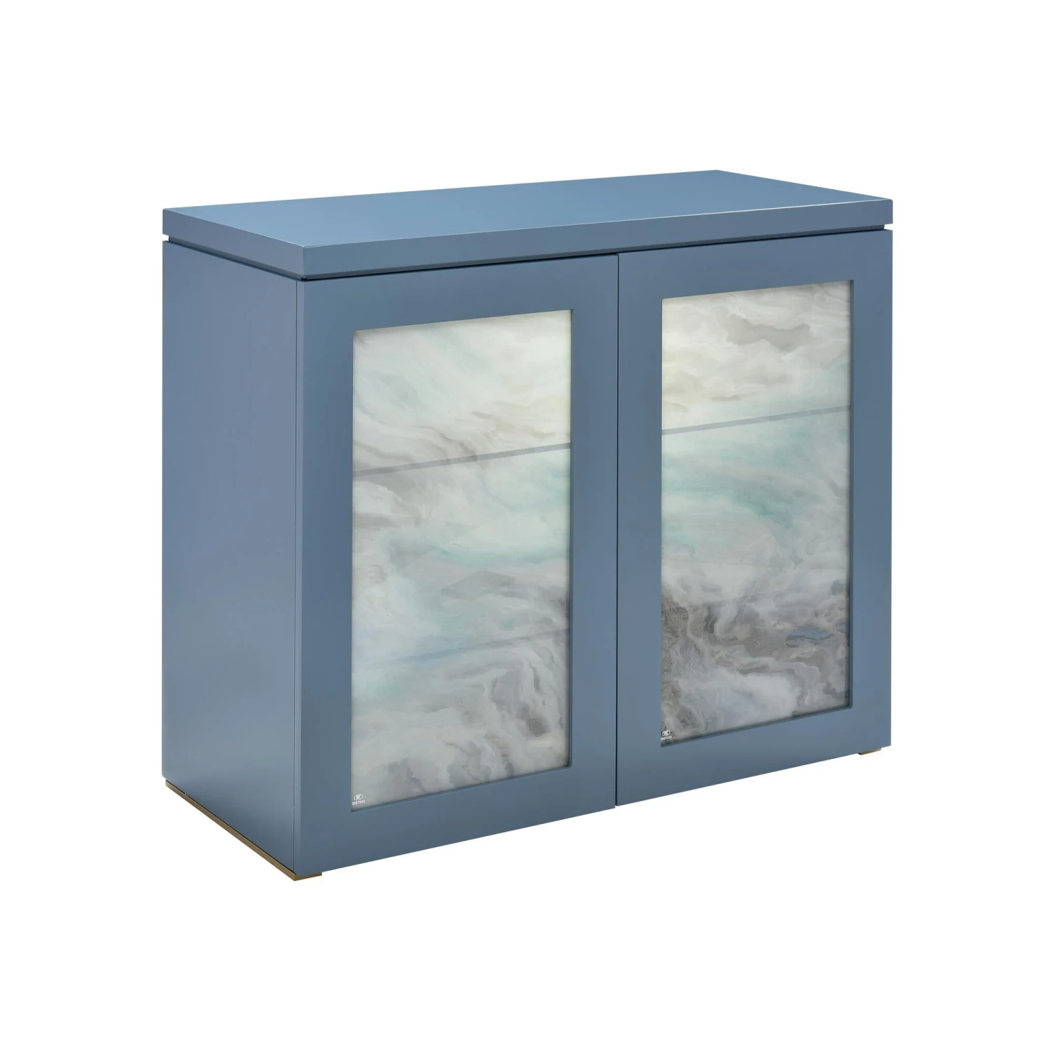 The Goldston Cabinet is a two-door storage cabinet painted in a Blue Mirage finish with reverse painted glass panels in the doors. The cabinet is lit inside and has glass shelves which allow the light to pass throughout the cabinet and illuminate the artwork on the doors.