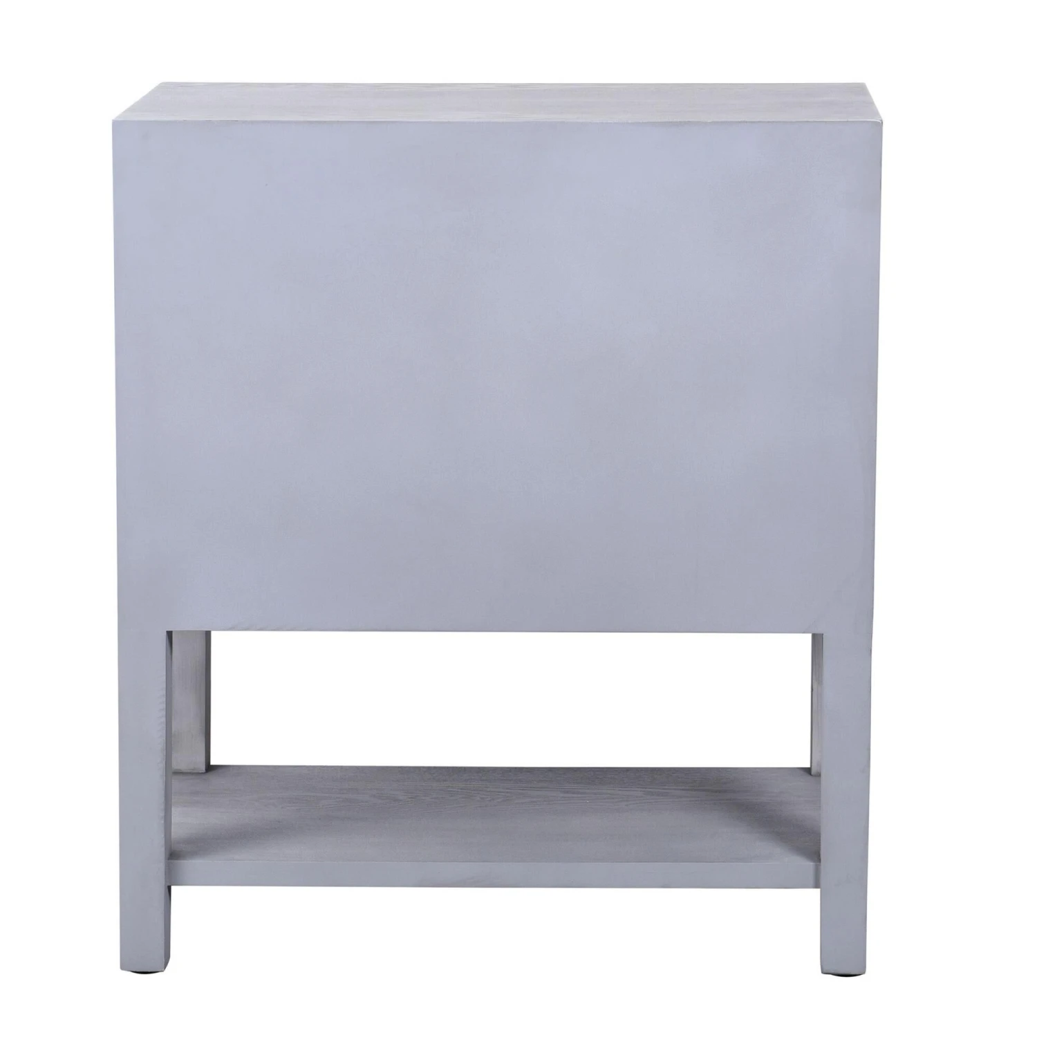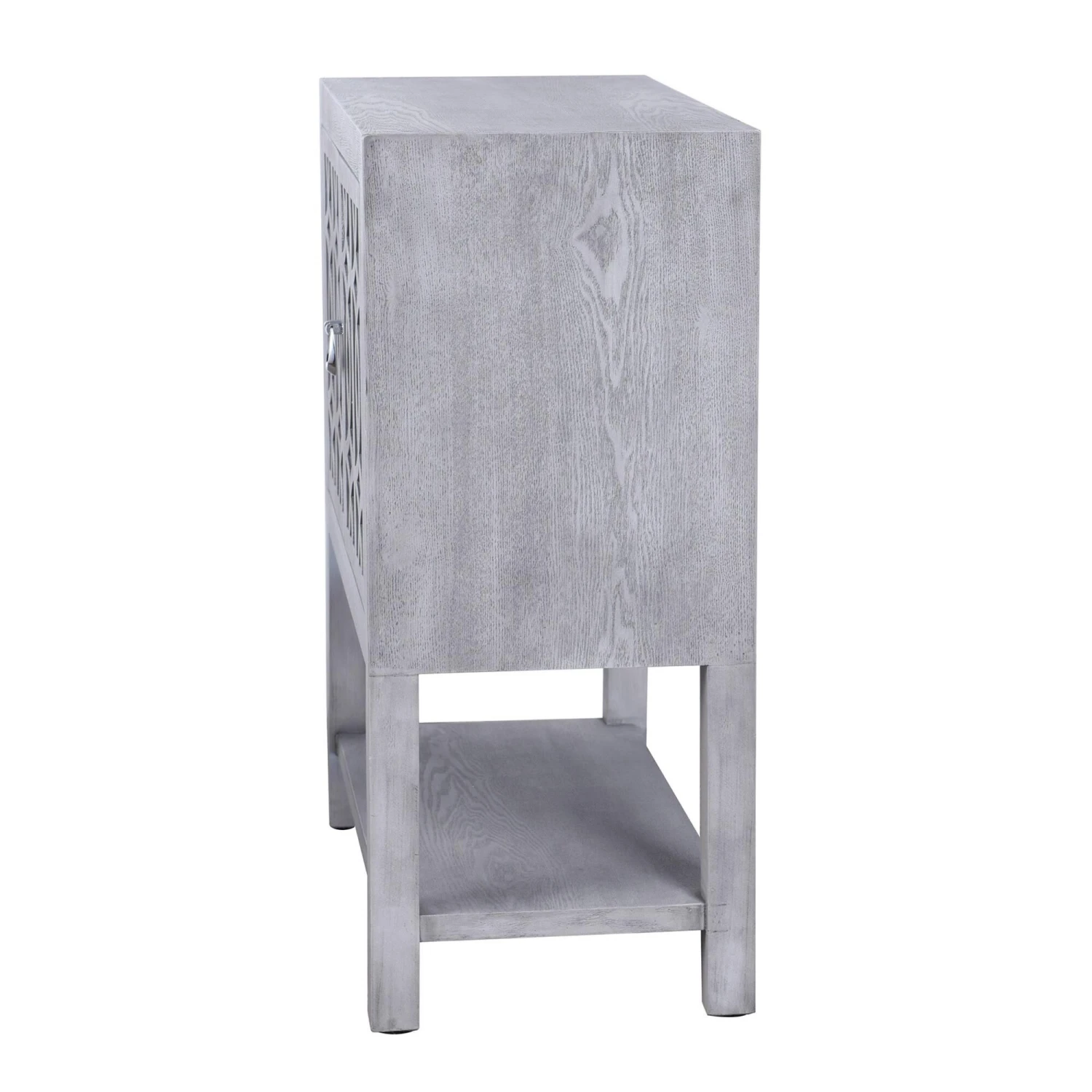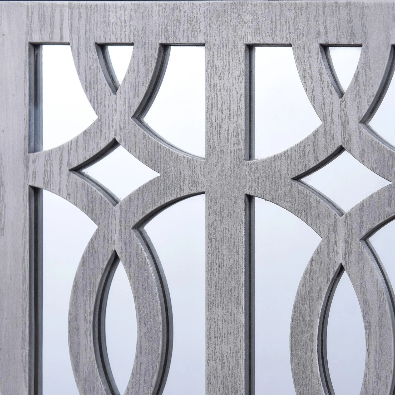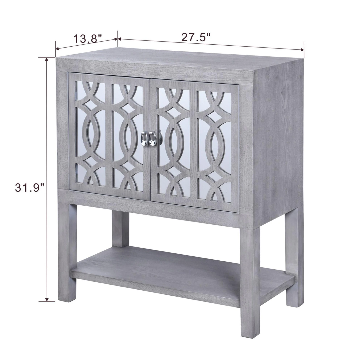 Made from MDF, ash veneer, glass, and metal, the StyleCraft Two Door Mirror Panel Cabinet is a functional and stylish piece for your home. This decorative cabinet features a circular cutting pattern with mirror decorations and an adjustable shelf. The adjustable shelf can be adjusted 2 inches either way as needed.FeaturesDue to the production process, each piece is unique and no two are exactly alike.The Gray Grain two door mirror panel cabinet features a circular cutting pattern with mirror decoration.This piece has am adjustable wood shelf on the interior that can move up or down 2″ as needed for storage.Shelf Color: Painted Gray & Wash GrayShelf Material: MDF, VeneerTop Color: Wash GrayTop Material: MDF, VeneerLevelersAnti-Tip Kit Included: Yes2 shelf, 2 DoorsCompartment Dimensions: 11.81X25.59X7.28″;12.6X26.38X7.28″;12.8X26.77X8.86″Floor to Bottom Clearance: 3.35″Weight Capacity: 50lbs/shelf