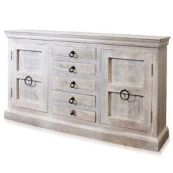 Bring rustic style and ample storage to a modern farmhouse-style dining room or kitchen with this StyleCraft Gray Wash 5-Drawer 2-Door Sideboard. This wood cabinet has two Doors fronting roomy cabinet spaces, on either side of a column of five drawers. All feature ring-shaped cast aluminum hardware in an aged bronze finish.FeaturesDue to the production process, each piece is unique and no two are exactly alike.This Is A Five Drawer Two Door Sideboard With Aged Bronze Cast Aluminum Hardware.This cabinet features a modern farmhouse design and a gray wash finish.Shelf Color: Gray WashShelf Material: Java HardwoodTop Color: Gray WashTop Material: Java HardwoodTable Shape: RectangularWooden Drawer GuidesAnti-Tip Kit Included: Yes2-Doors,5-Drawers, 1-shelfDrawers: 16.5″W x 11.5″D x 3.5″H ; Inner Doors Total Height: 31.75″, Top Shelf Space: 21.5″W x 13″D x 19.25″HBottom Shelf Space: 21.5″W x 13″D x 15.75″HWeight Capacity: 250lbs
