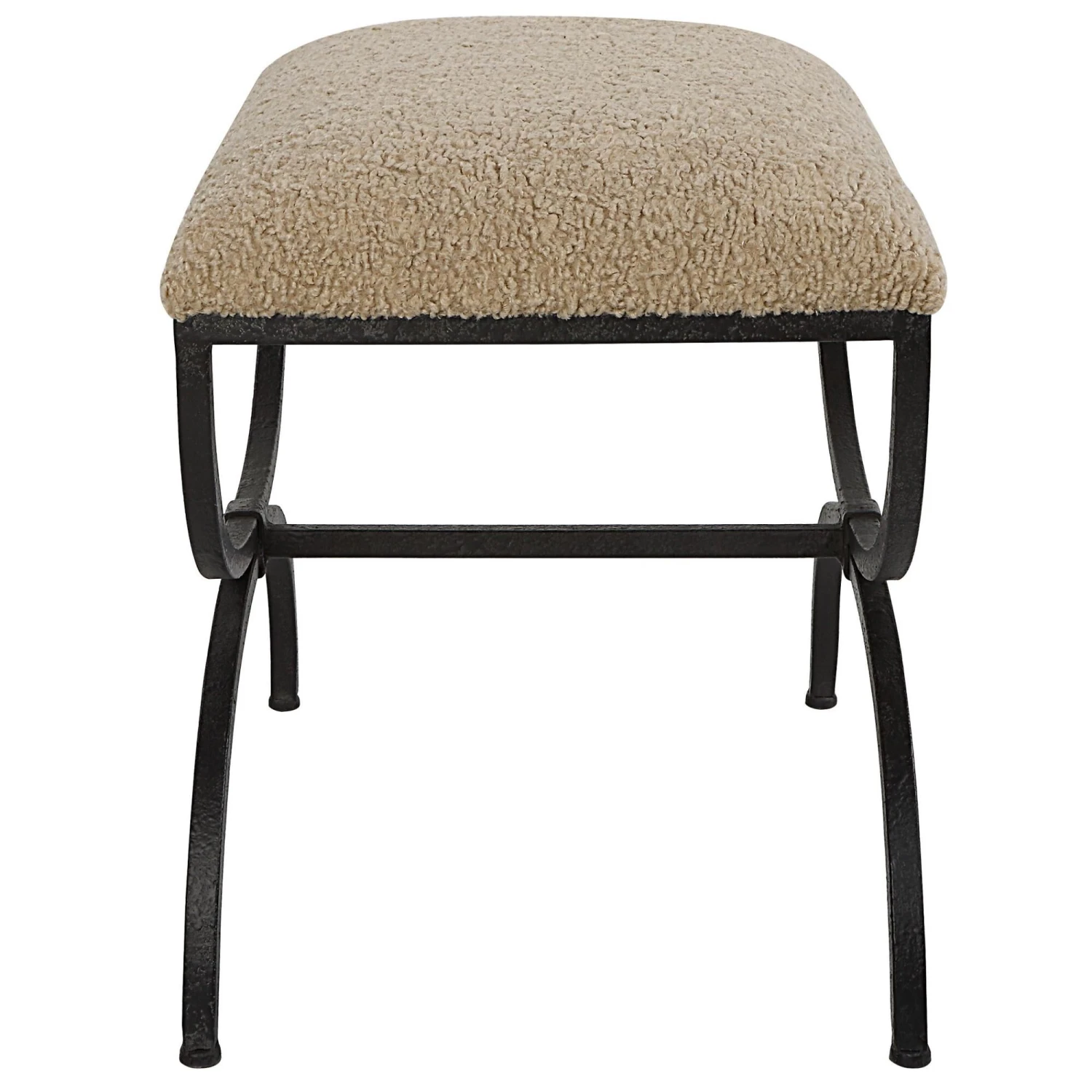 Influenced By Spanish Architecture, This Small Bench Features A Heavily Textured Iron Base Finished In Aged Black Topped With A Plush Faux Shearling In Latte.