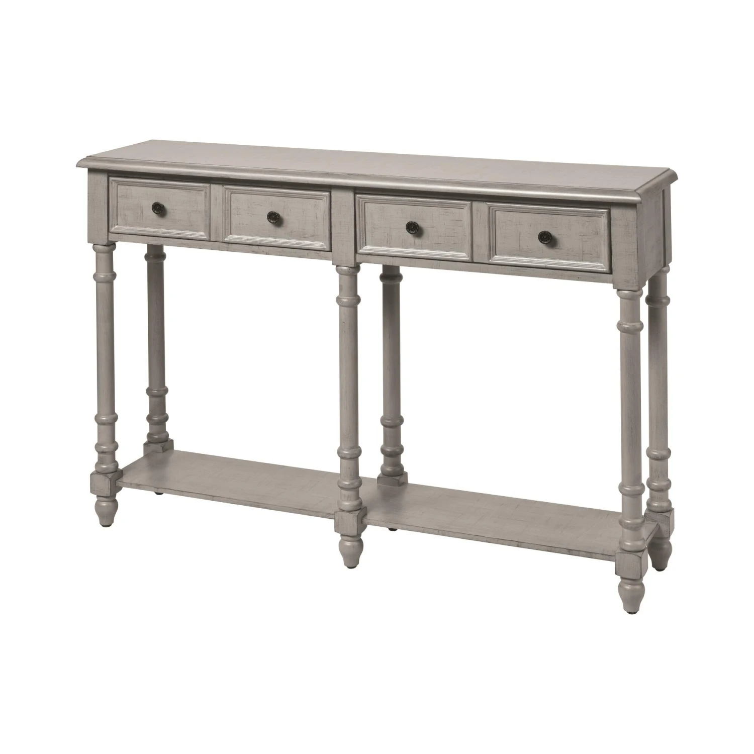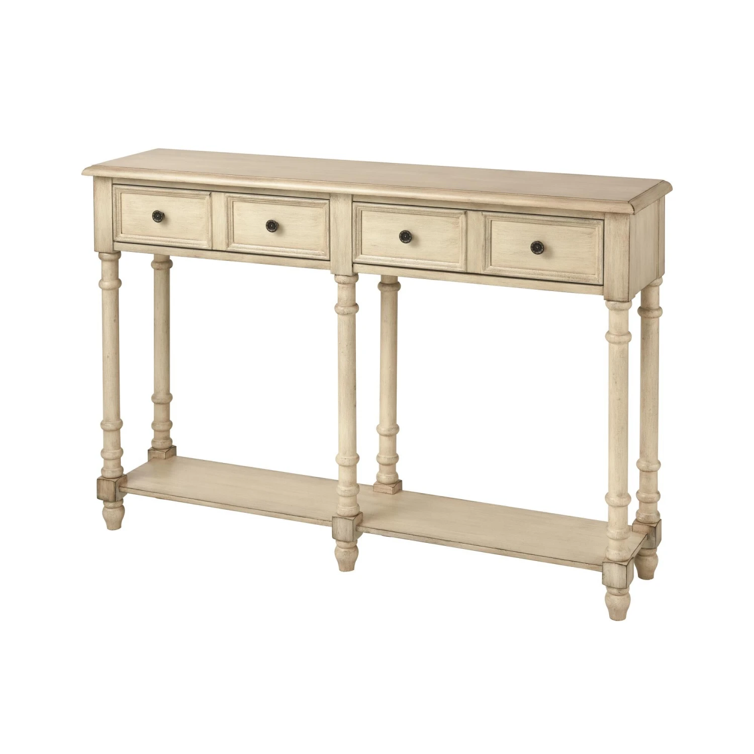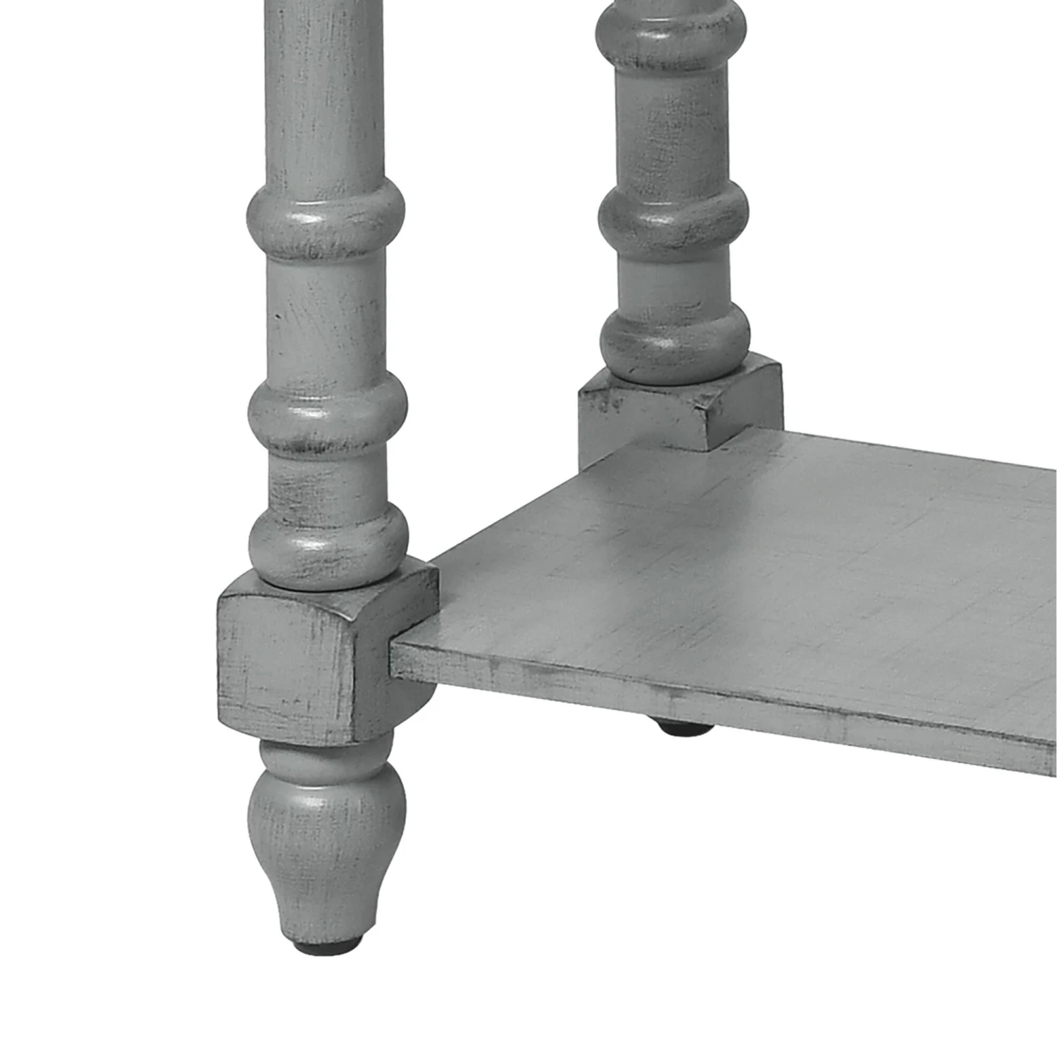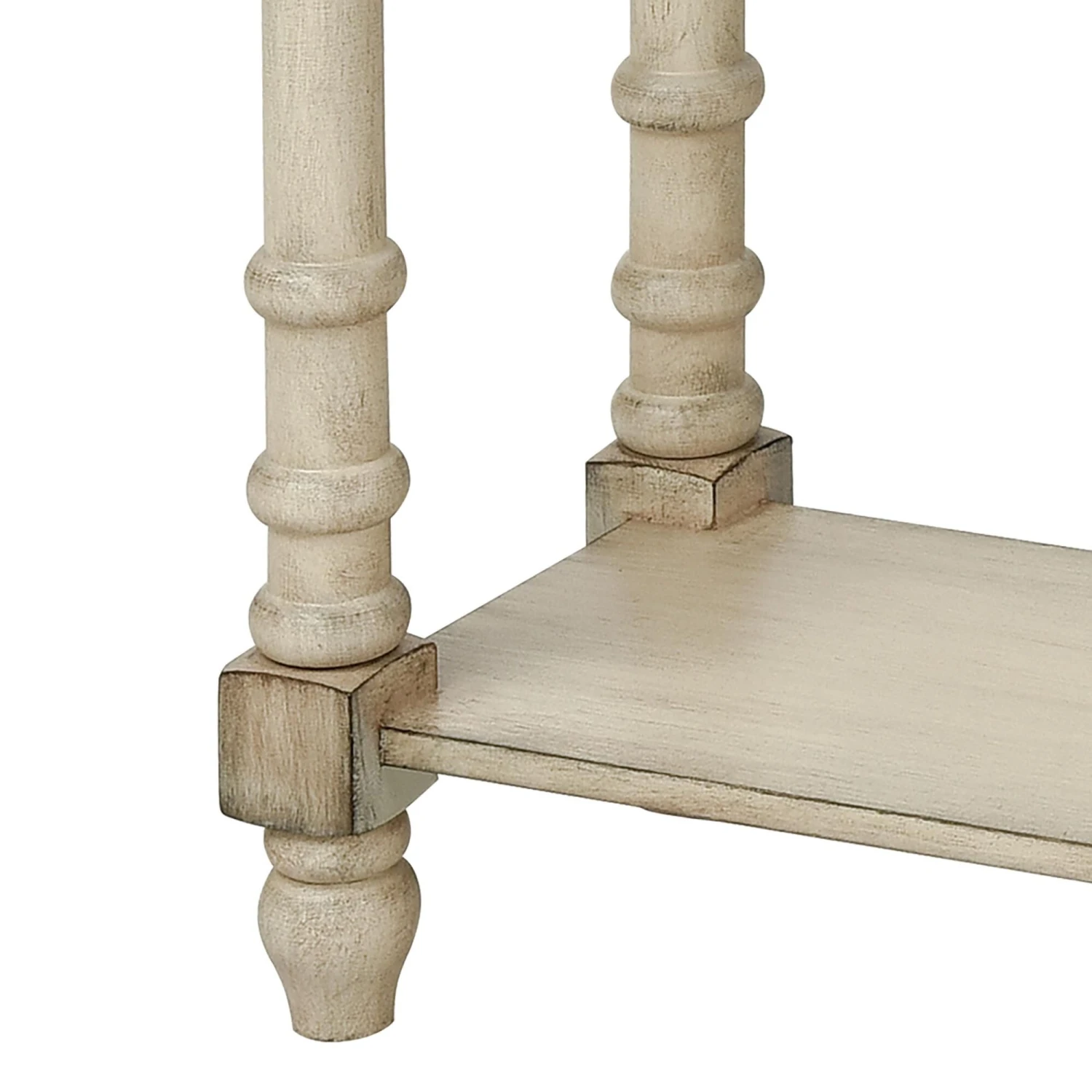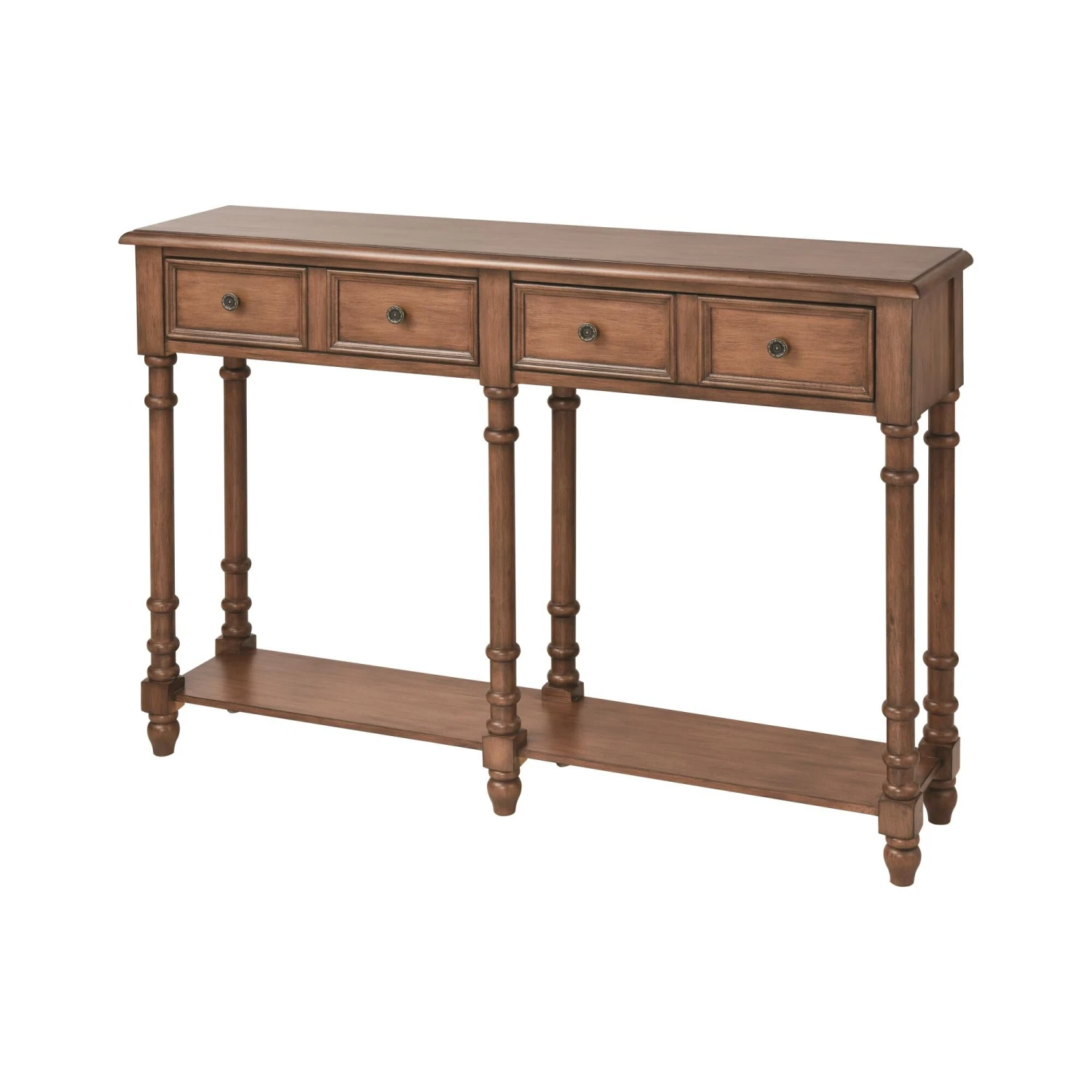 Two-drawer console table with lower storage shelf Hand-painted medium mahogany wood-tone finish Classic round metal knob hardware Six turned post legs.