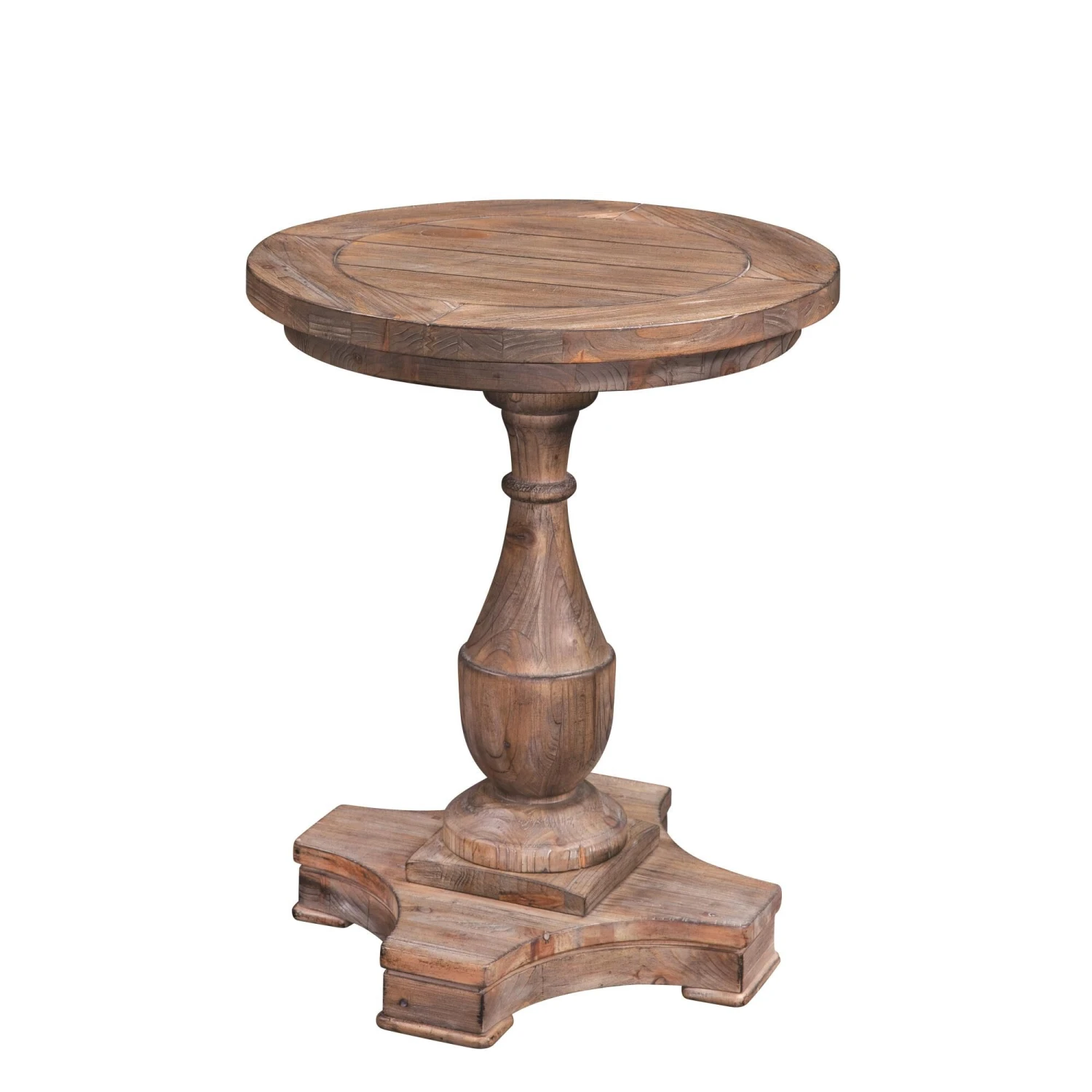 The Hitchcock Round End Table features our premium multi-step finishing process that gives the appearance of a weathered found item wire-brushed in Pine.