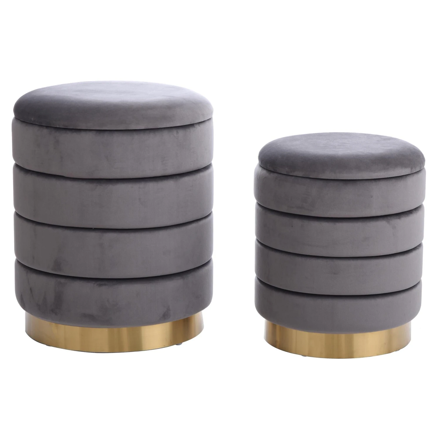 Elegant velvet and clever texturing make the Hollace Ottoman set a welcome addition to any living room. Horizontal lines run across the circular frames, giving the teal fabric added texture while creating symmetry with the gold accenting band. This nesting set offers excellent storage and convenience to go with its bold aesthetic appeal.Features -Due to the production process, each piece is unique and no two are exactly alikeThis item is sold as a set of 2 ottomans. Both ottomans are composed of ribbed textured teal blue velvet fabric with a gold finished metal band that decorates the base of each ottoman.Set of 2 ottomans have a multifunctional design, where they can be used for storing items inside them. The tops of each ottoman lift off to expose the storage cavity held inside.These ottomans ship nested together and do not require assembly.The height of these two ottomans are: ( 19″h & 16″h ).Specifications -Weight Capacity: 75Location Rating: Dry
