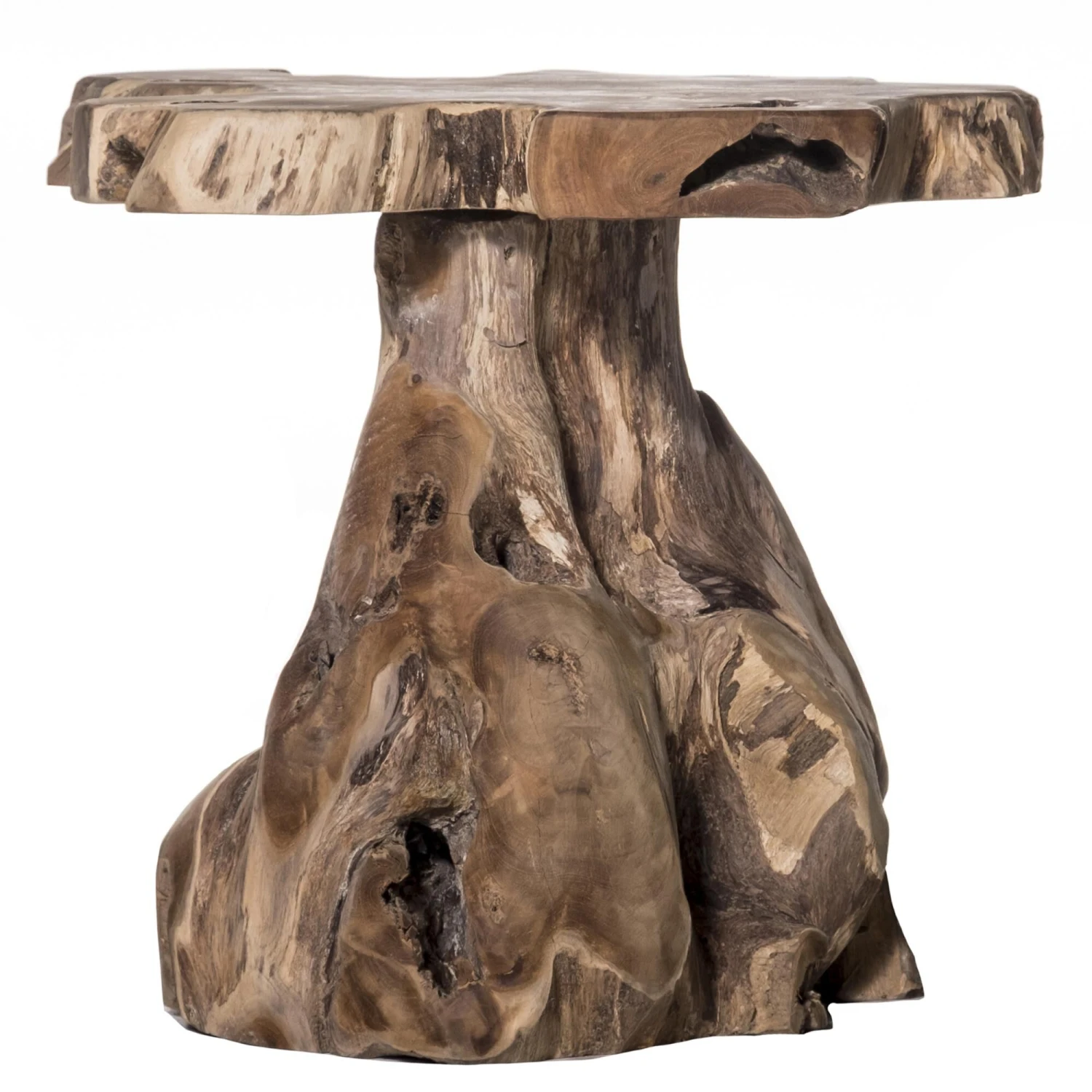A striking piece made of beautiful teak, the Jakarta Stool features a natural finish along its rugged edges and base. The smooth top surface provides a useful space in a living or guest room, while the thick trunk gives the stool a commanding presence. Functional and rustic, this piece showcases its inherent beauty throughout its stout design.Features -Due to the production process, each piece is unique and no two are exactly alikeTable is created from solid teak wood that has a natural matte finish.Teak wood table has a free form teak wood base & table top edges.Table has hollowed out area’s found within the teak wood which can be seen in both the base & table top.Table comes completely assembled.Specifications -Weight Capacity: 75Location Rating: Dry