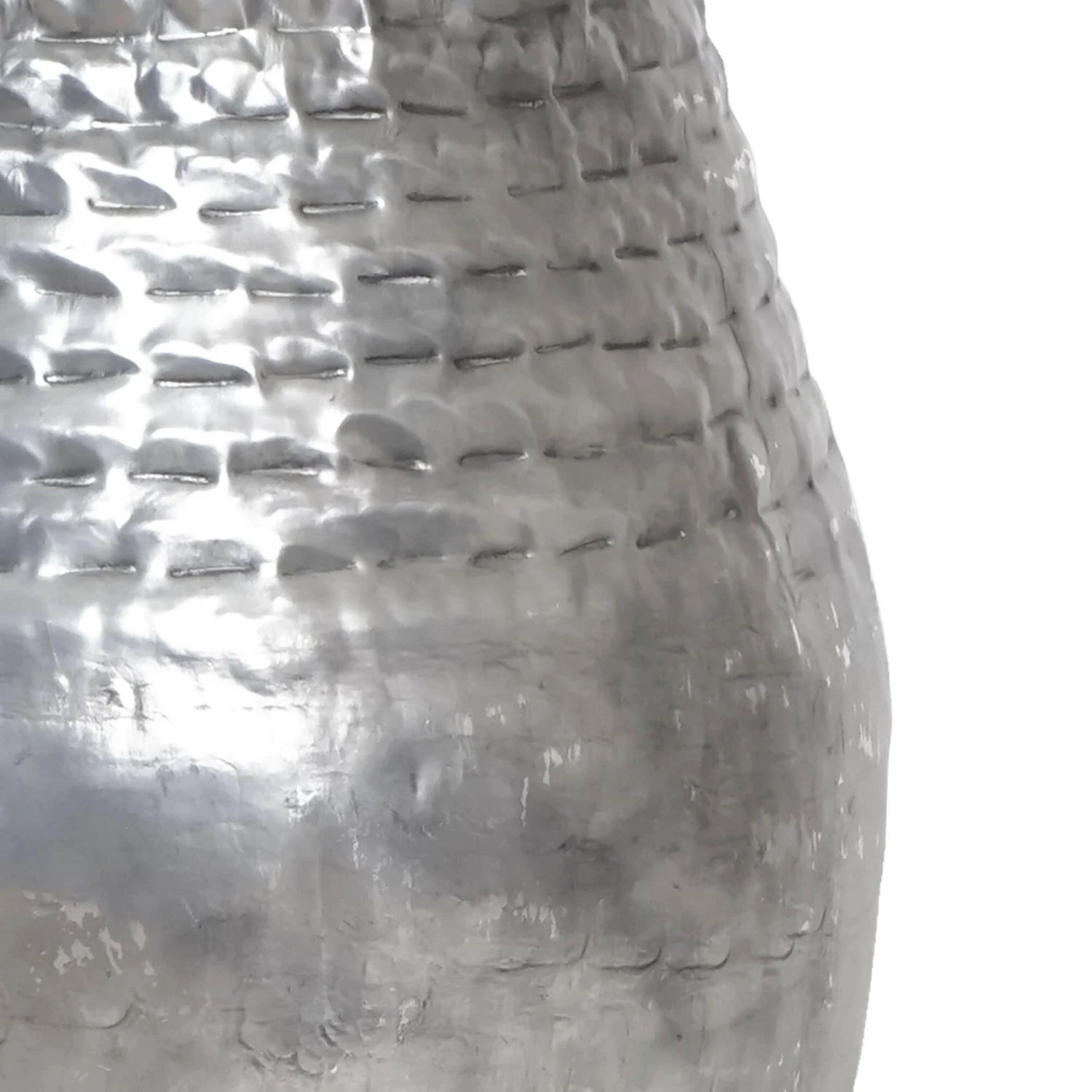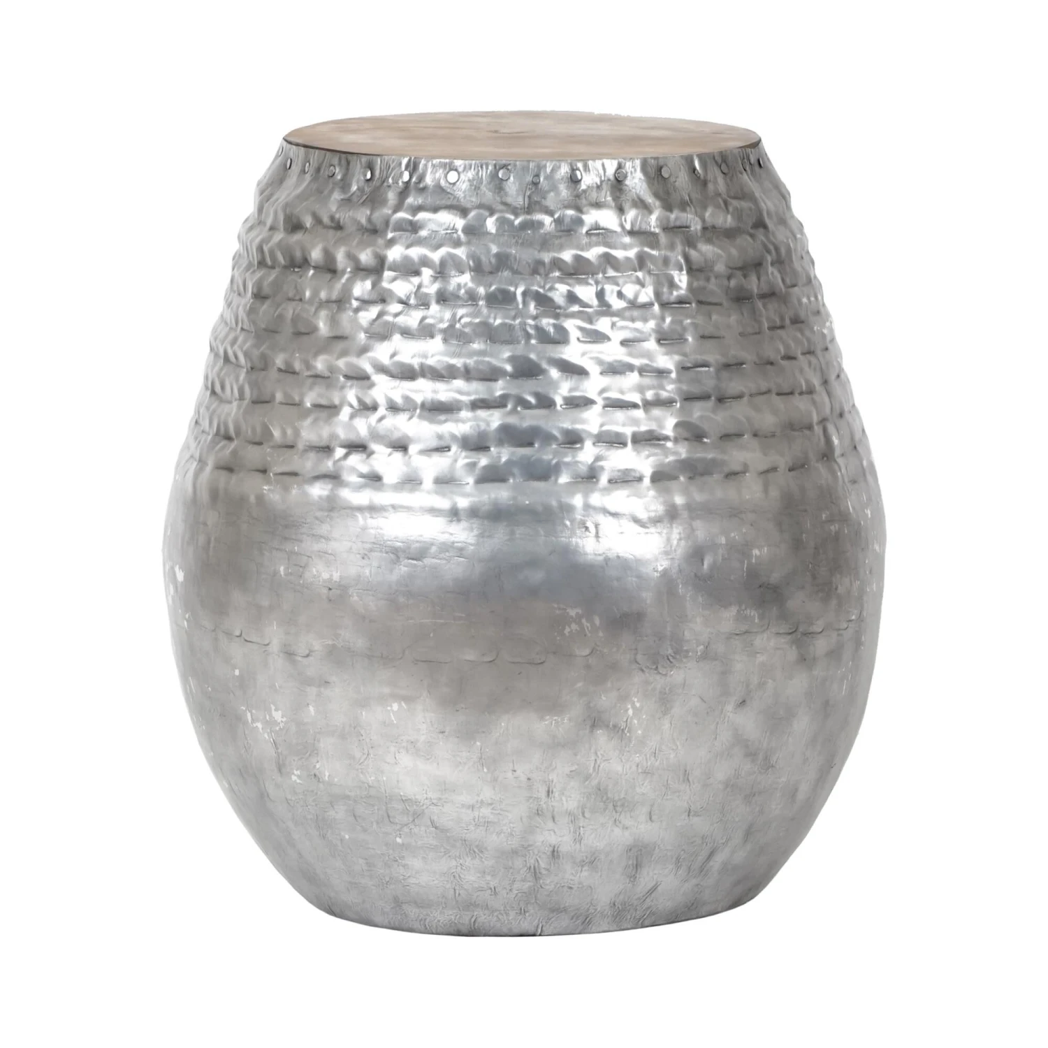 The bold curves of the aluminum Kendang drum stool feature hammered texture detailing and a natural, teak wood seat. Perfect for adding a glam, metallic element to any seating area.