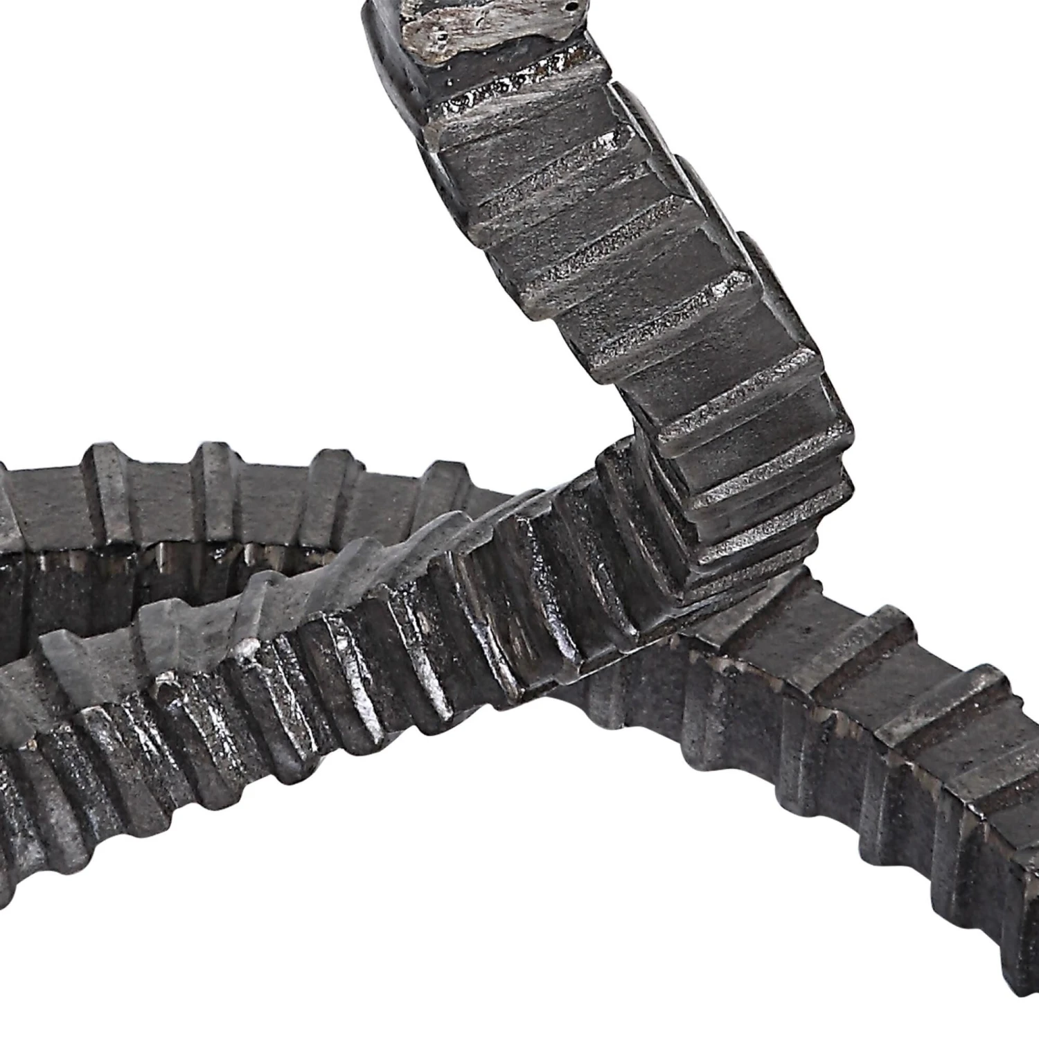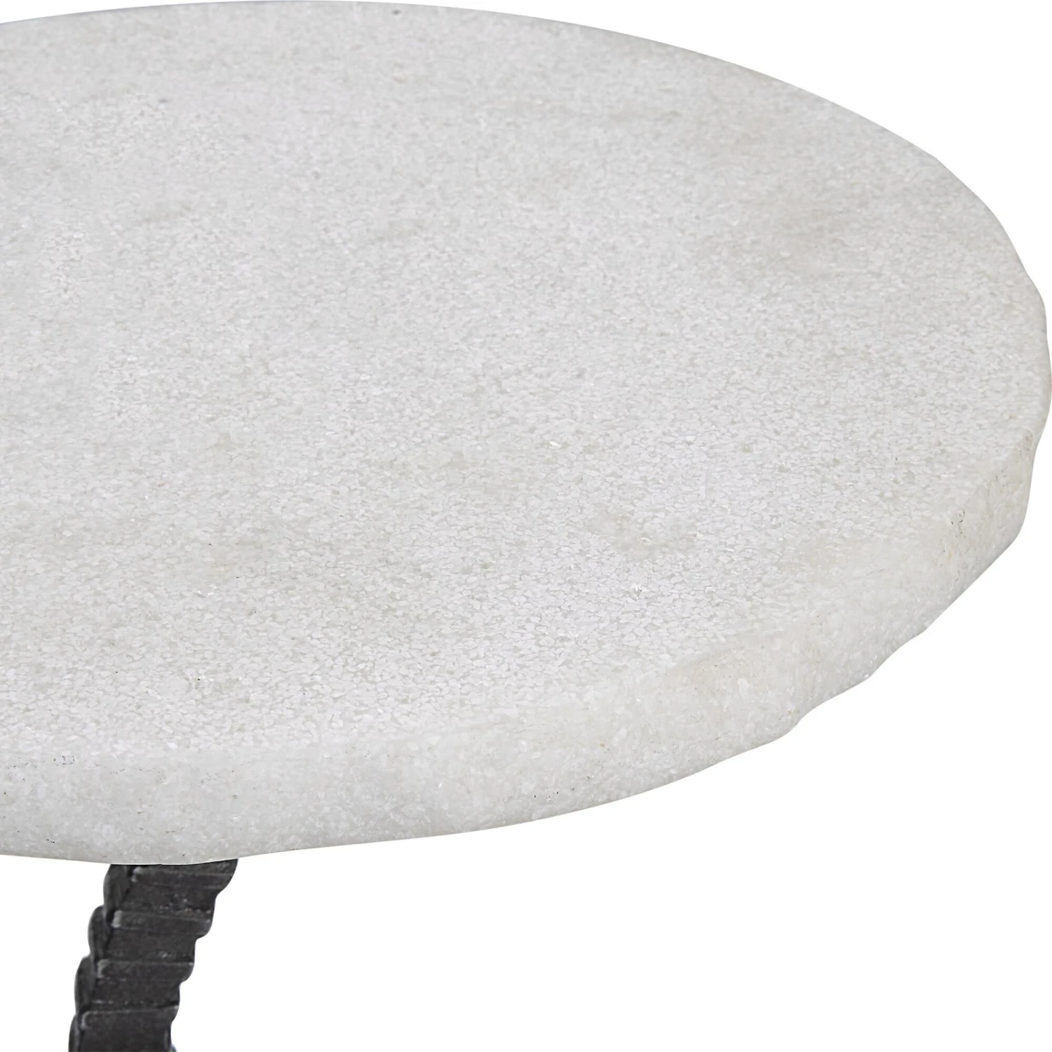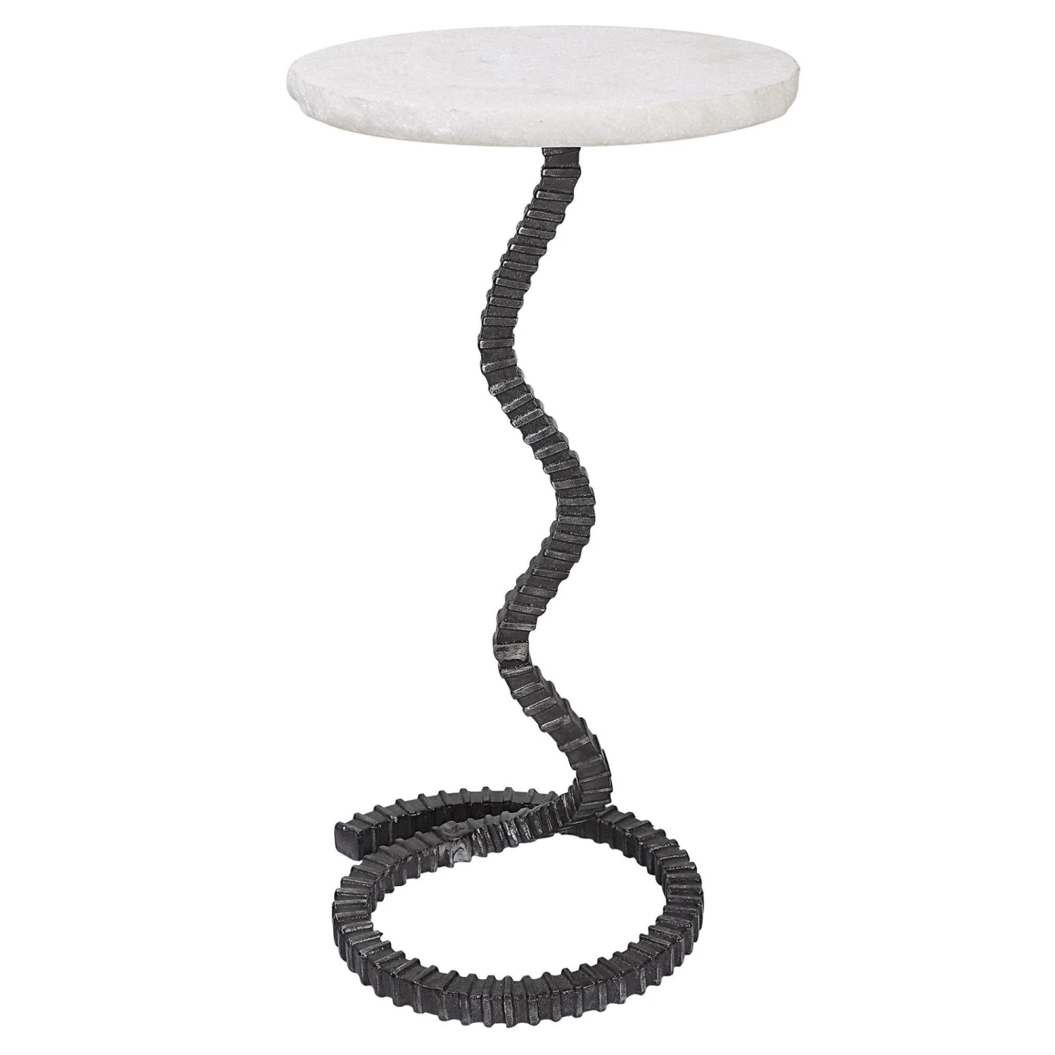 This Contemporary Drink Table Is The Perfect Accent For Your Favorite Book Or Cocktail. The Cast Iron Base Is Coiled Into Unique Curves With Notched Details In A Gunmetal Finish, Paired With A Chiseled Edge Stone Top In White That Accurately Replicates The Look Of Thassos Marble.
