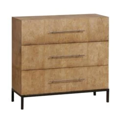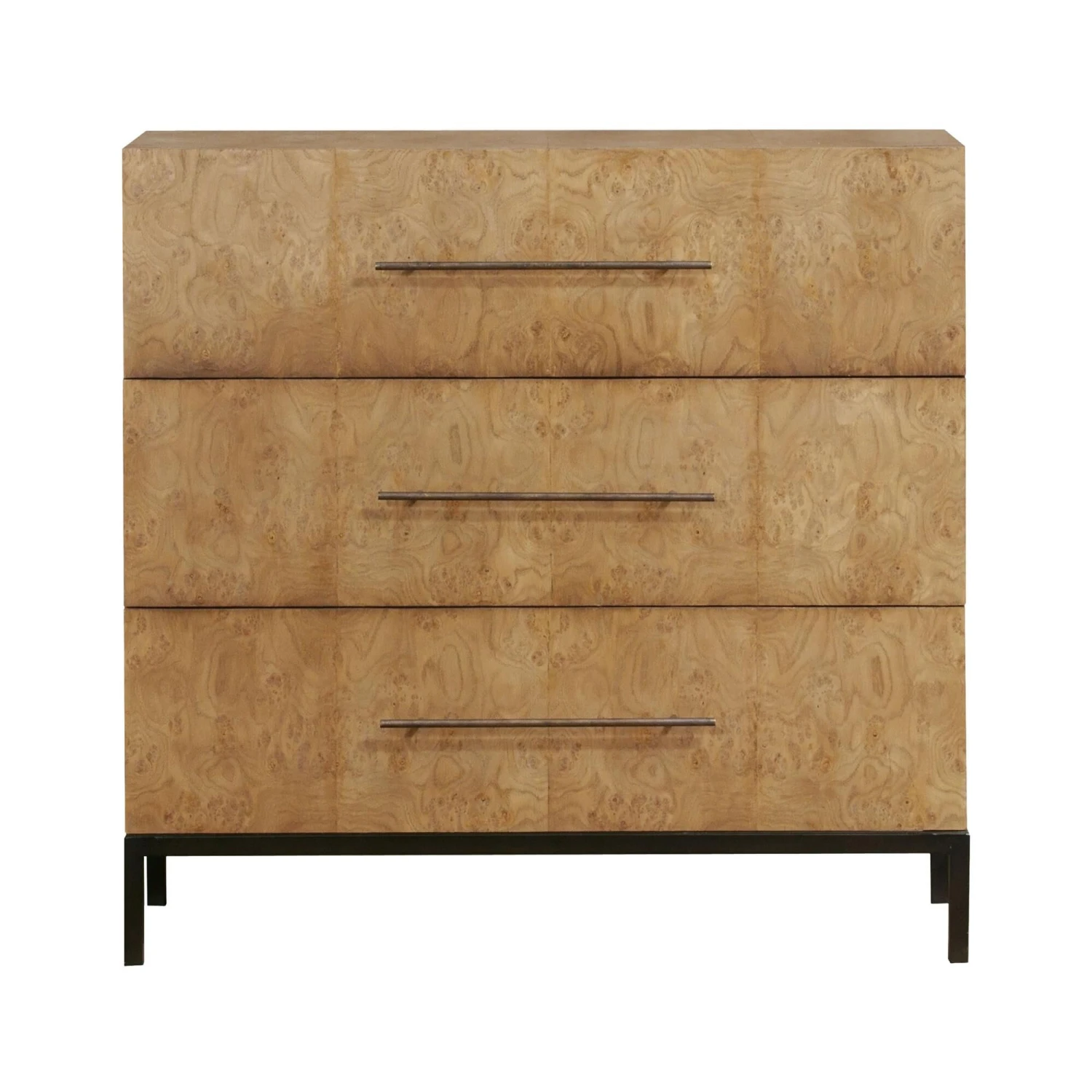 The Marc 3-Drawer Chest is a burled wood storage piece. Three simple drawers have metal bar handles. This piece is perfect as a nightstand or dresser in a bedroom.