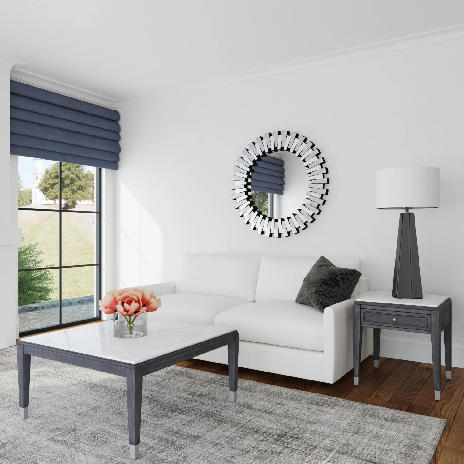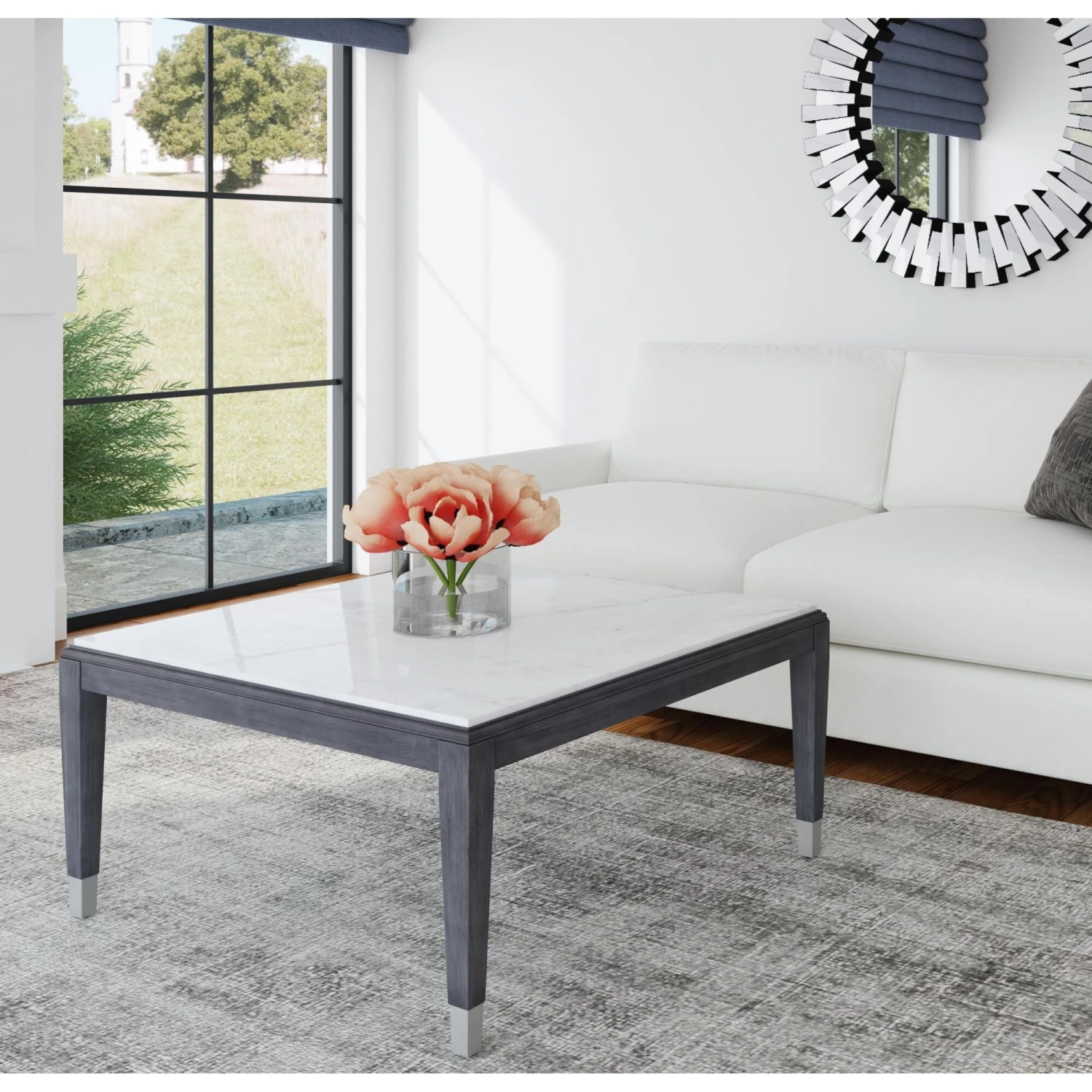 The North Bend Cocktail Table features modern contemporary styling with high constrasting black and white finishes. The genuine marble table top sits on a brushed graphite, black wood frame. The white and gray marbling compliments the nickel footcaps at the bottom of the tapered legs. Also includes adjustable floor levelers. The marble top is a natural stone and is a completely unique product of nature. The natural marble is subject to variations in characteristics such as veining, color, pattern and mineral deposits.