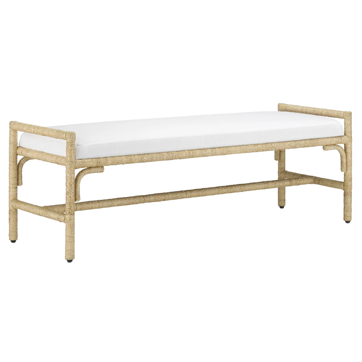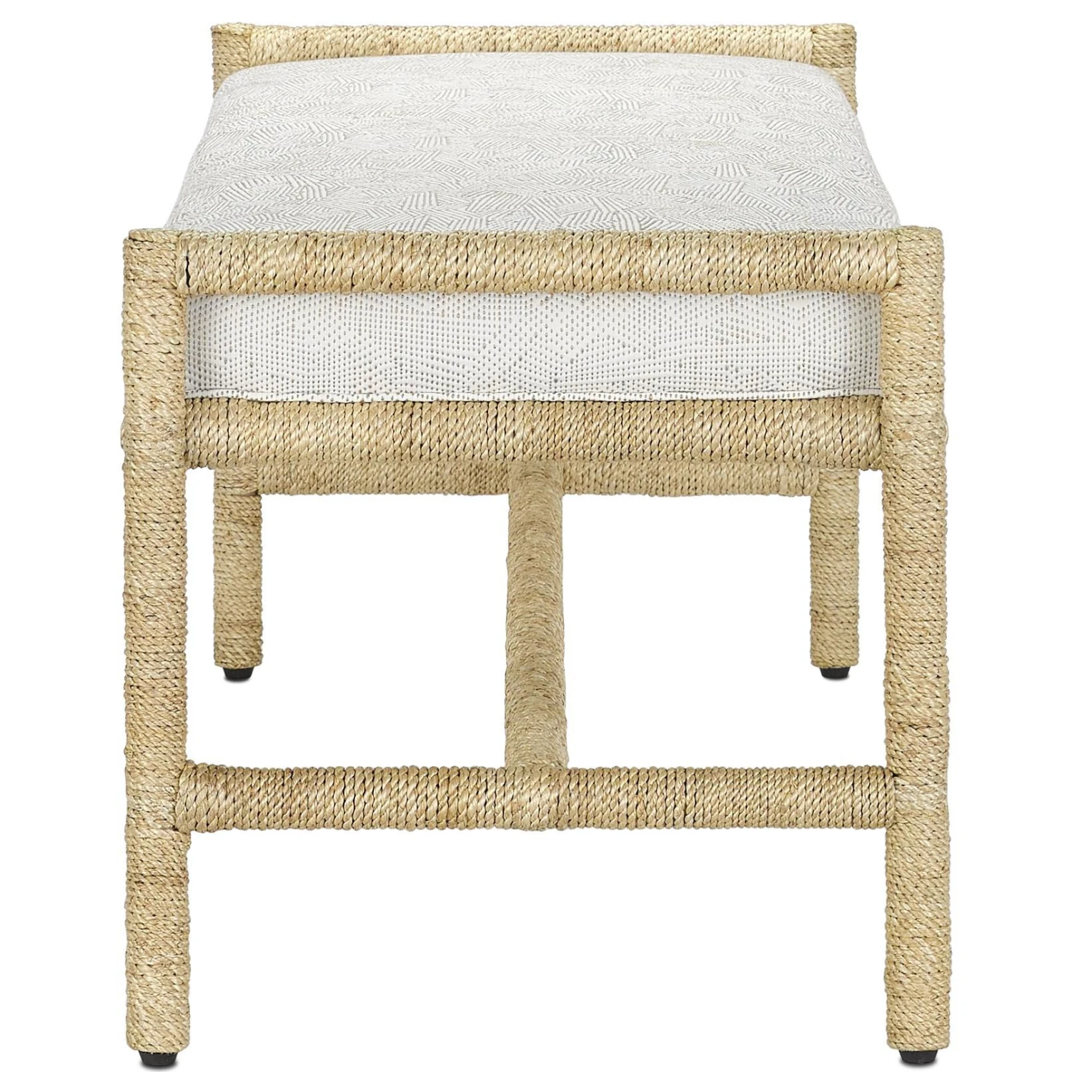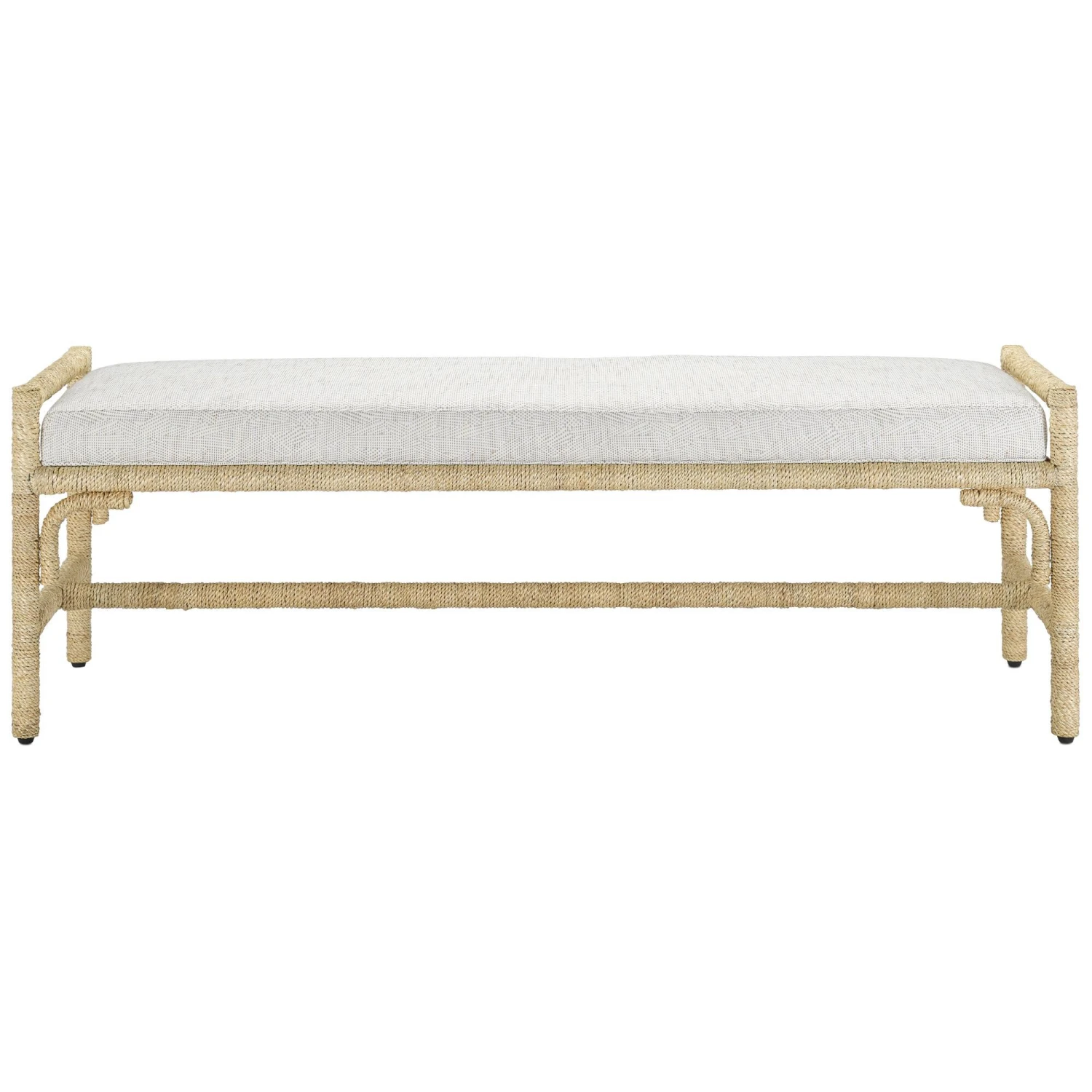 With the earthy feel of rattan and wicker but with a much heavier dose of personality, the Olisa Pearl Bench is a wrap star! Made of wrought iron that is covered in braided Abaca rope, this bench would make a noteworthy statement in an oceanfront retreat or in a lovely lakeside residence. Upholstered in Rowann Pearl fabric, which is made of 40 percent rayon, 33 percent cotton, 25 percent polyester and 1 percent nylon. We also offer the Olisa Pearl as an ottoman. Cleaning code: S. Also available in muslin.