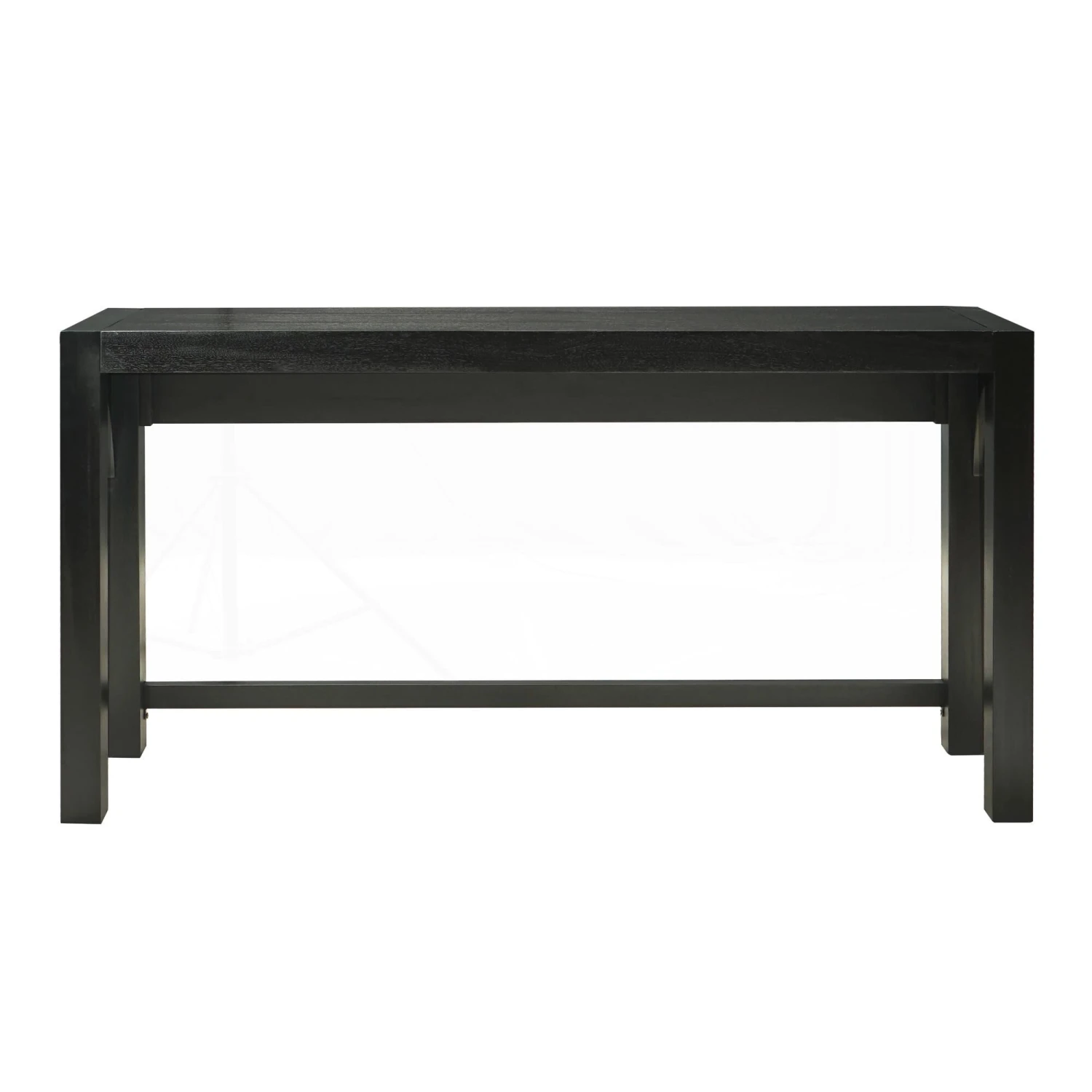 The Patten Console Table is a versatile mahogany storage table with an arch detail on each side. A single support beam at the bottom makes this piece ideal as a console table, desk, or bar surface which supports up to three counter height stools that tuck underneath. Made from Mindi wood and stained in matte Kettle Black, this piece is finished on all sides, so it can be displayed behind a sofa in an open-concept floor plan.