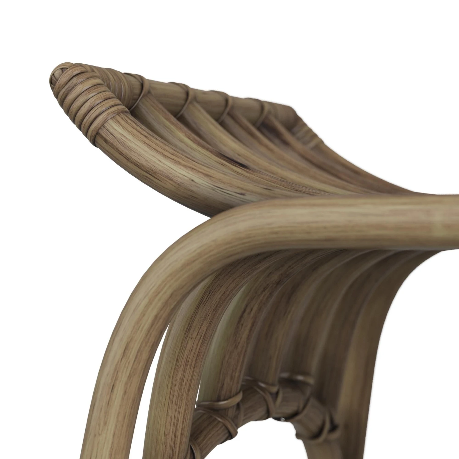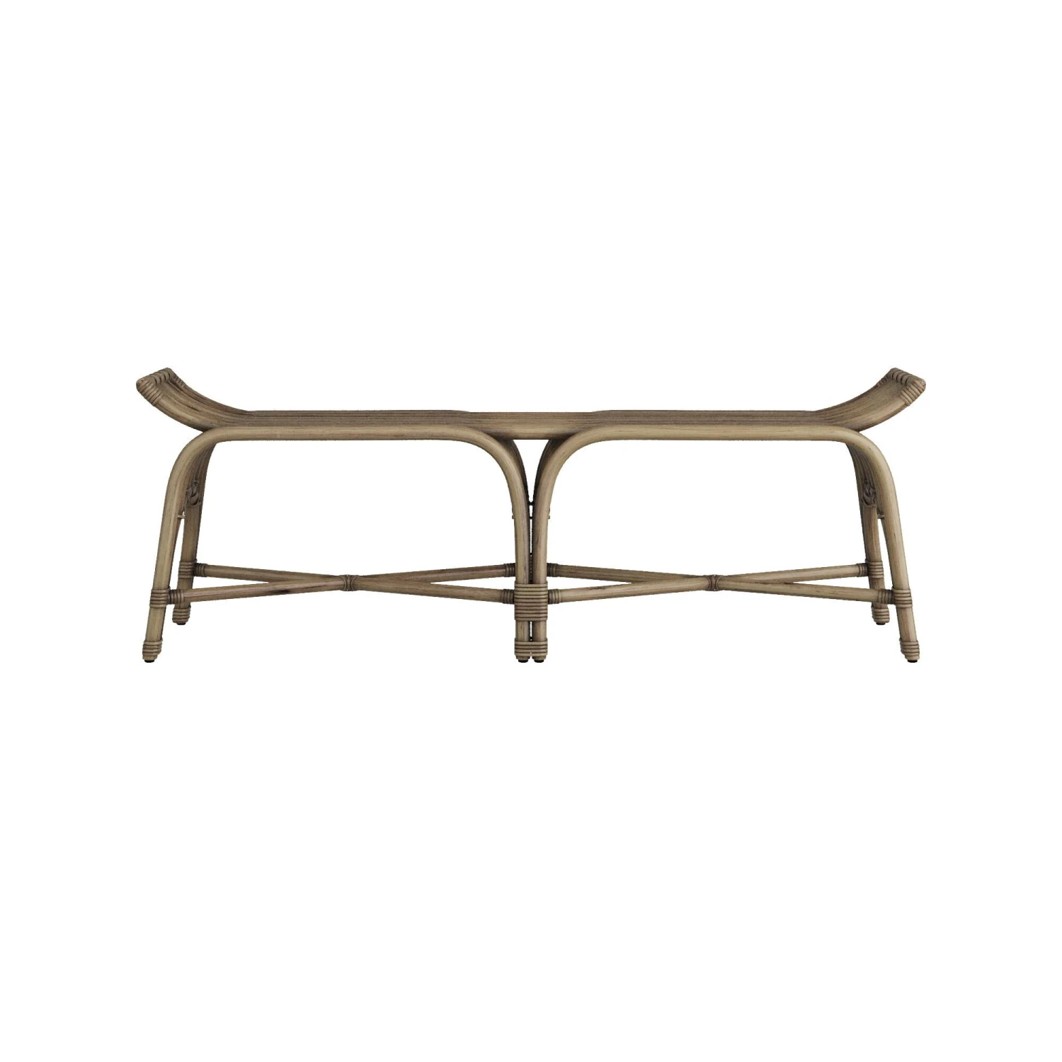 Intersecting linework on the Purcell Bench recalls the graceful curves found in classic Roman stools. The long rattan pole bench, in a neutral gray wash, transforms any space with an easy, relaxed elegance. Finish will vary.
