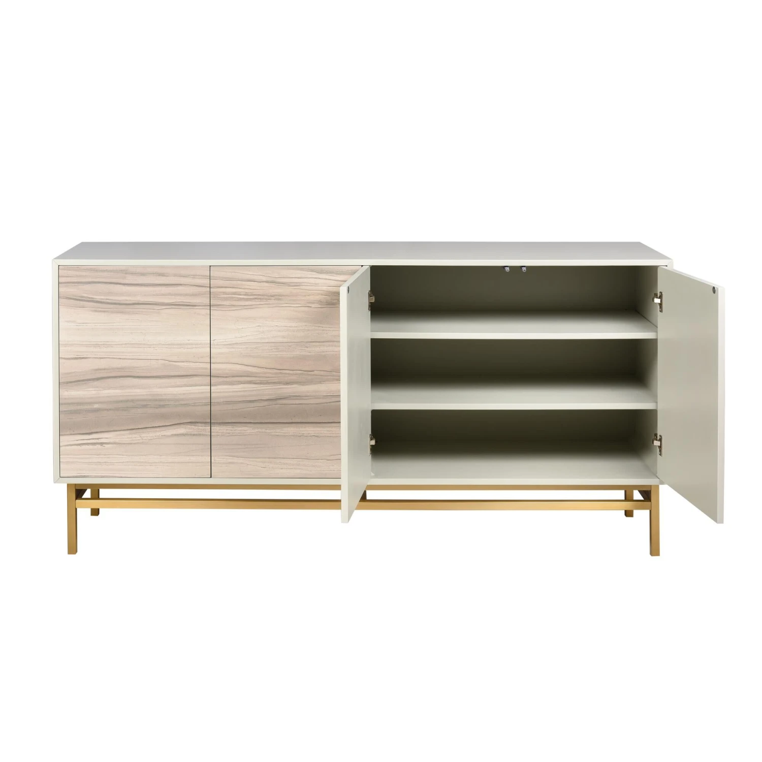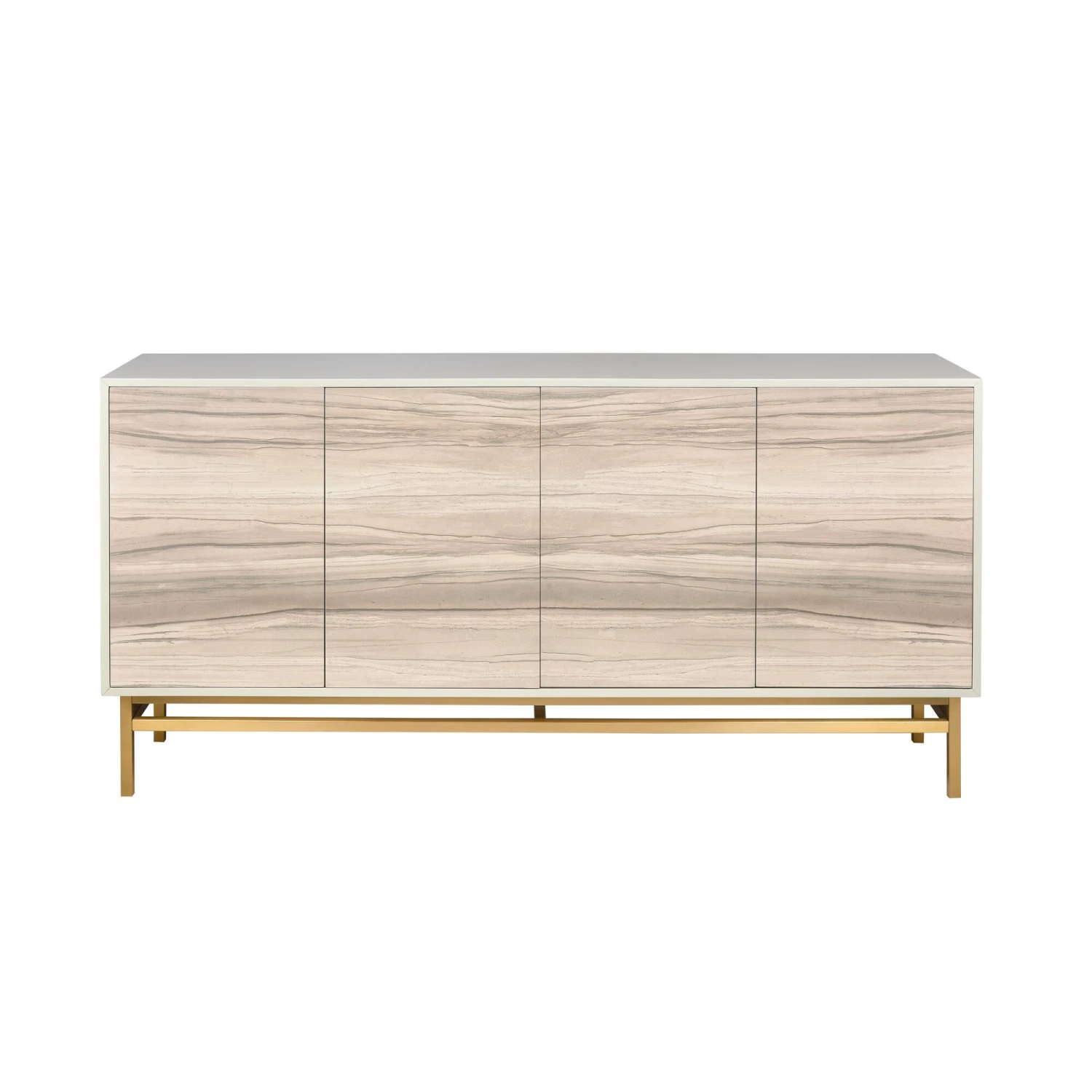 The Reynolds Credenza is a four-door cabinet is finished in a cream color and has an abstract design painted on the four front doors. The neutral palette of cream, taupe, gray and sand are calming and the cabinet would blend easily in many lifestyles. The brass tone base elevates the look. This piece has adjustable shelves and provides ample storage space.