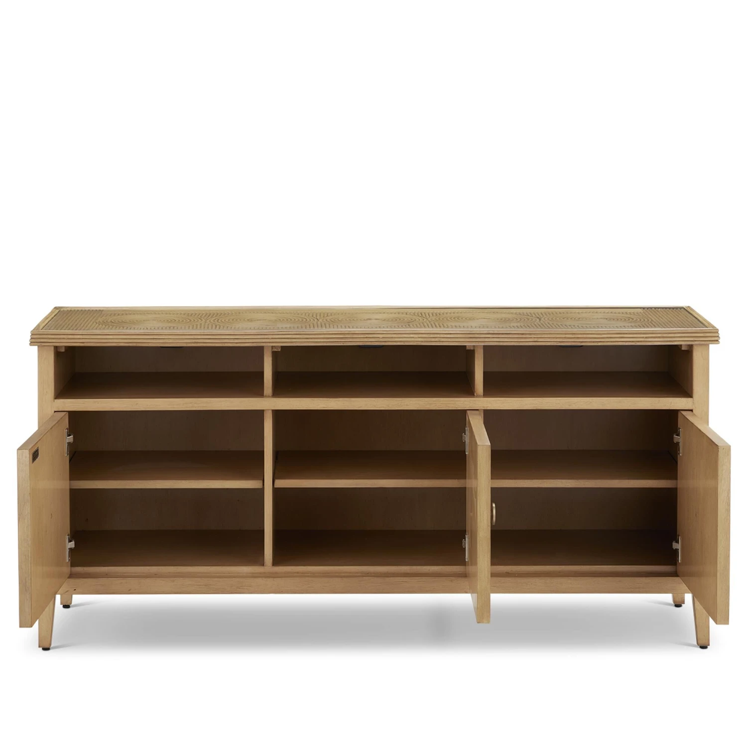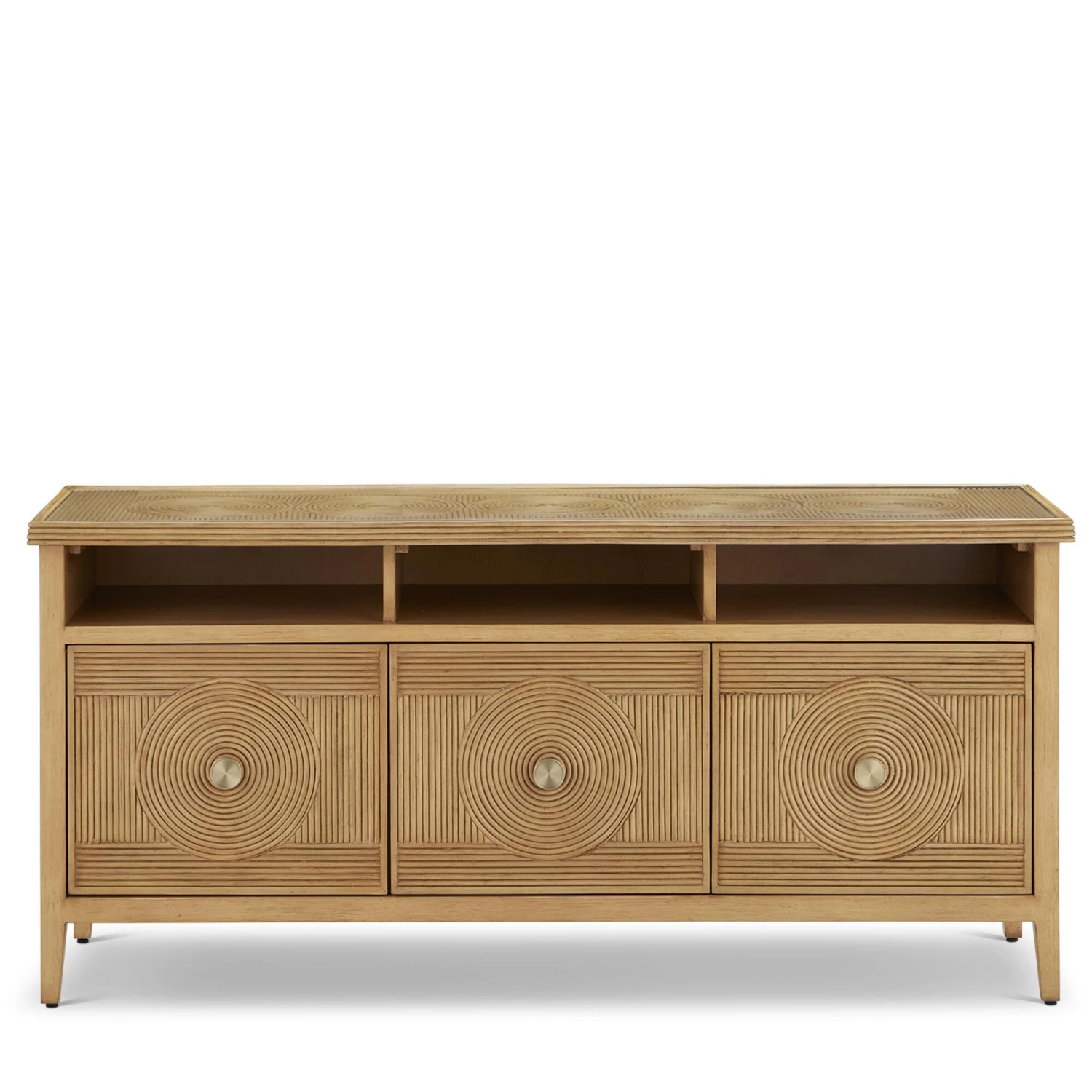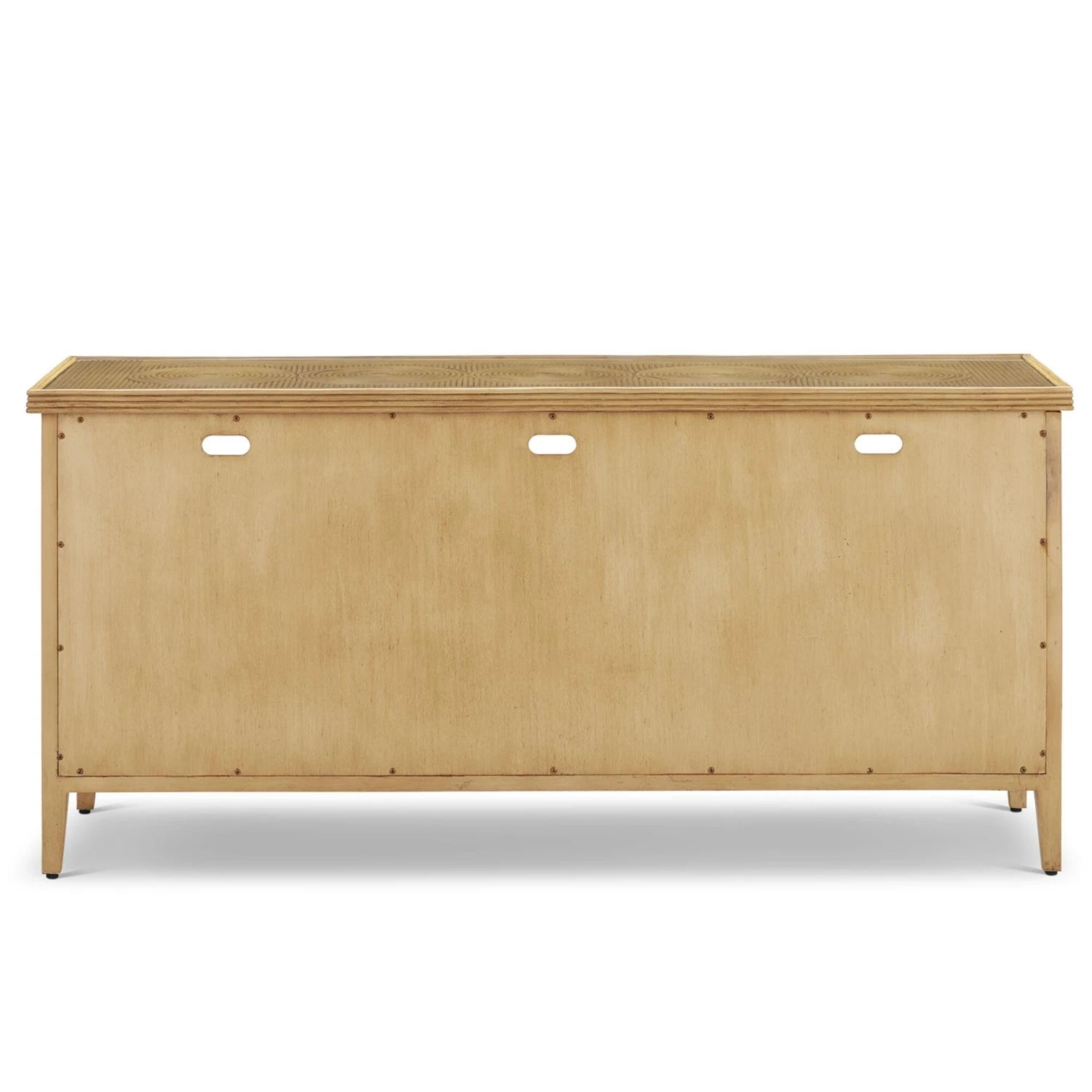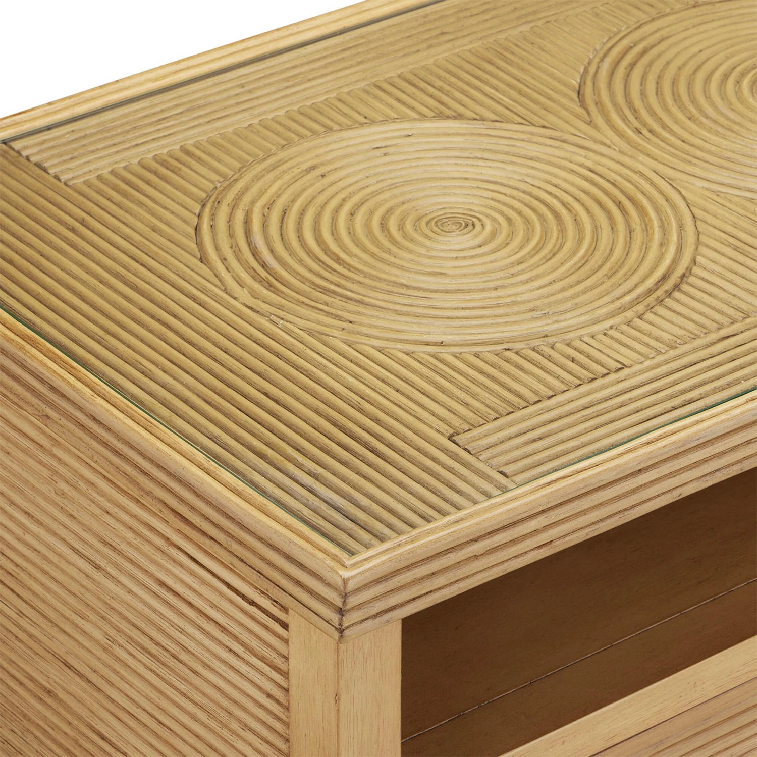 The Santos Sea Sand Rectangular Cabinet has a split rattan pattern on the doors, sides, and top, which is made by hand and applied to a solid mahogany frame. Then a Sea Sand finish is applied to the entire piece. A design detail of note is how the brass pulls sit squarely in the center of the layered circles created by the pattern. This tan cabinet was designed by Aimee Kurzner.