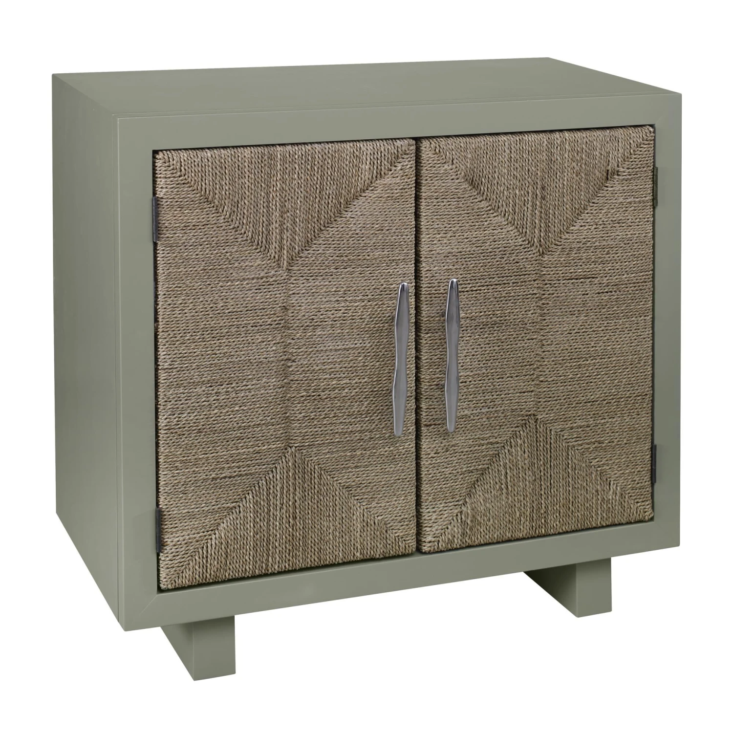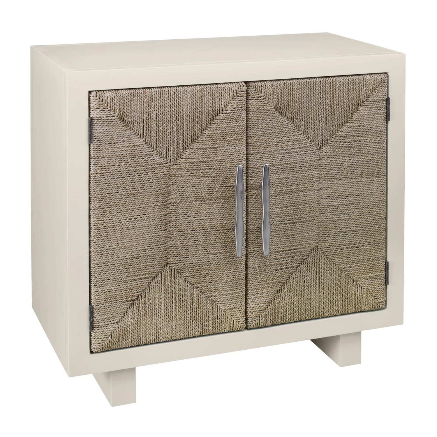 The Sawyer Cabinet is a two-door storage cabinet with inner shelving. The doors feature woven seagrass paneling and cleat hardware. Decorative stitching highlights the natural beauty of the seagrass doors. The look is coastal-inspired and versatile.