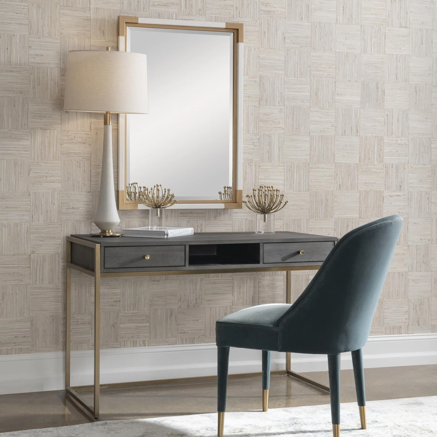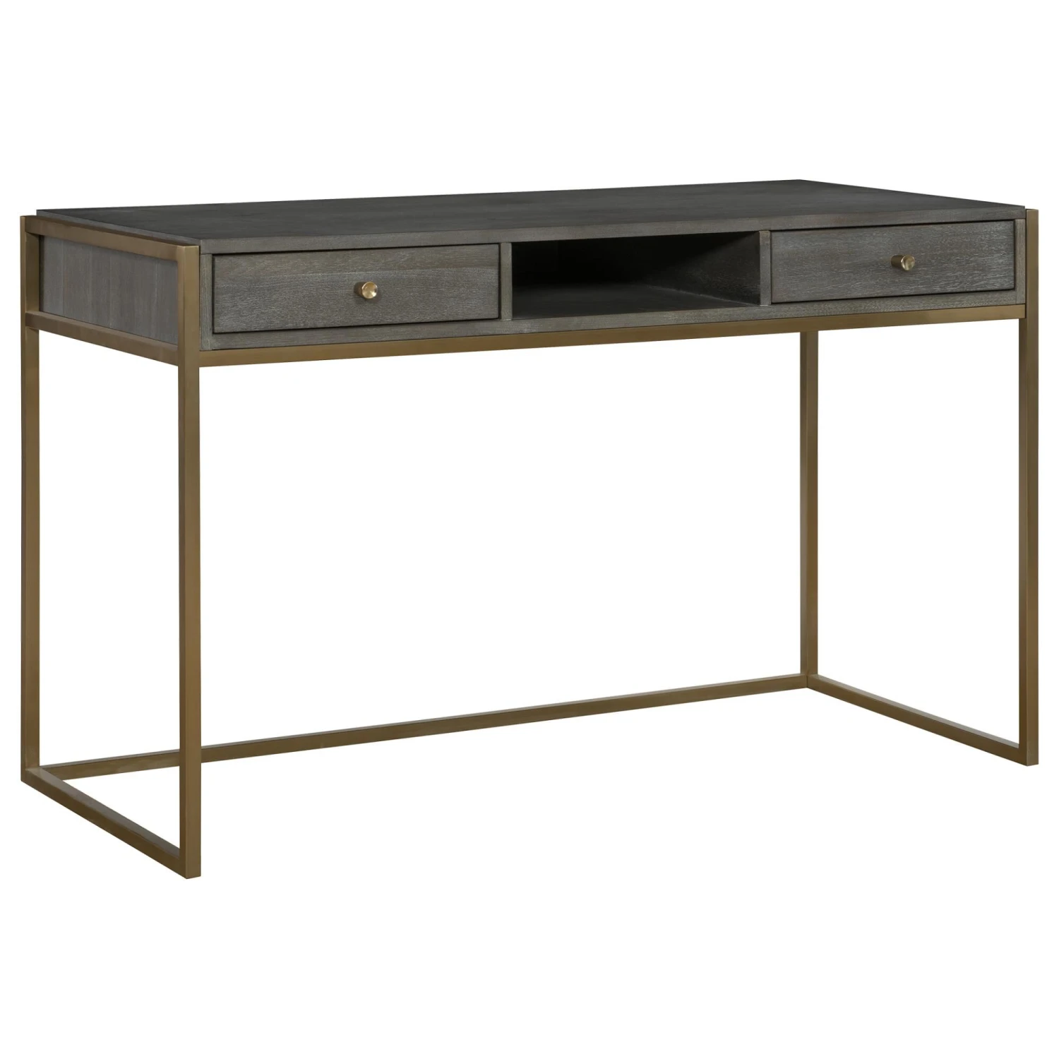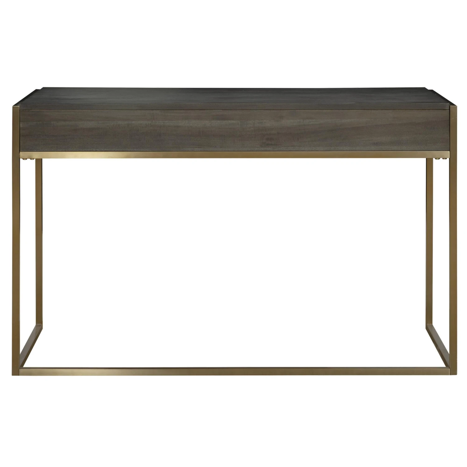 Contemporary In Style, This Writing Desk Features A Sleek Stainless Steel Framework In Plated Brushed Brass. The Top Is Crafted From Acacia Veneer In A Dark Walnut Stain And Light Gray Glaze With Brass Drawer Pulls.