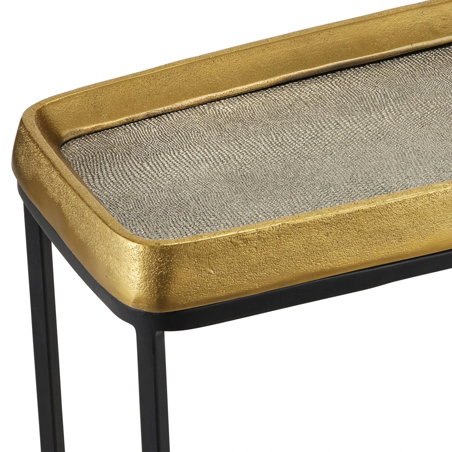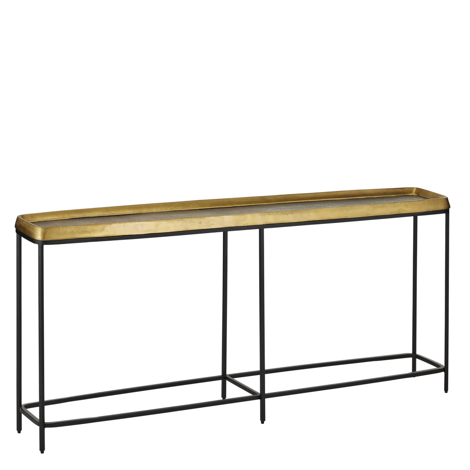 The Tanay Brass Console Table is not shy when it comes to infusing a space with an incredible mix of textures. Not only does the cast aluminum top have tell-tale pitting on the surfaces of its gleaming gold interior and exterior edge, the bottom of its tabletop is stamped in a snakeskin pattern in a graphite finish. This masterpiece of artistry sits atop a black iron base that is minimal to allow the artisanal top to be the scene-stealer.