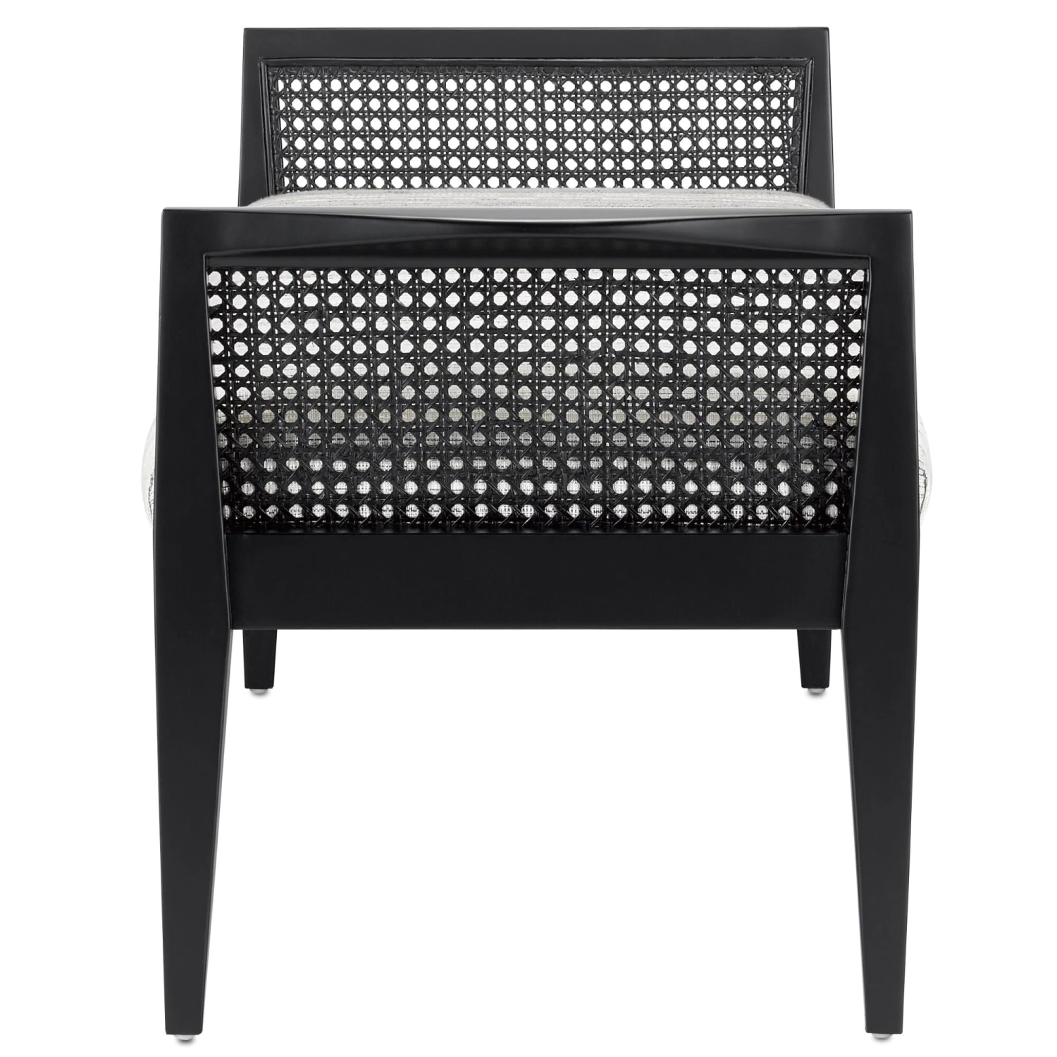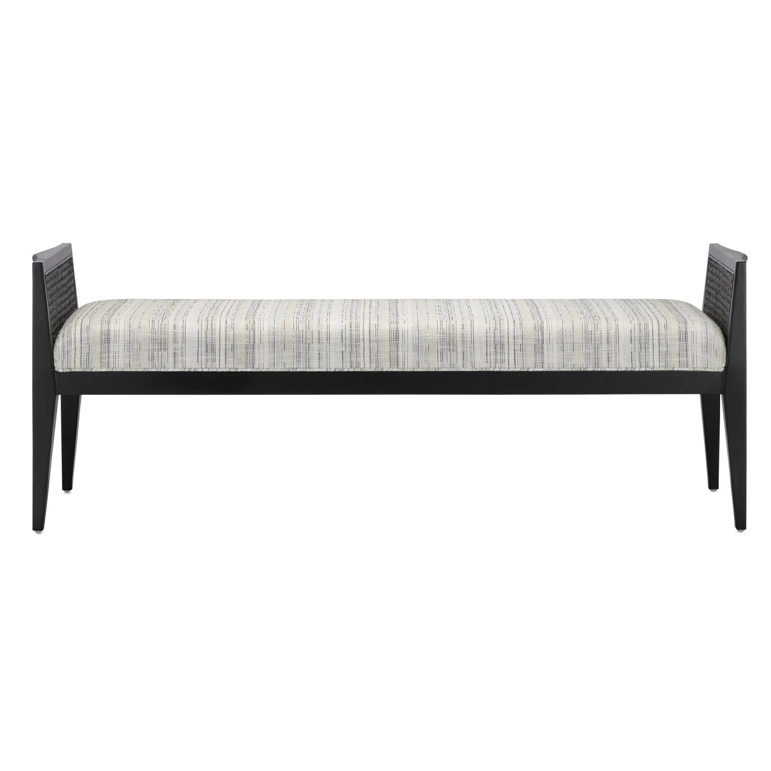 A dark beauty, our Teagan bench has handsome cane sides and a beech wood frame, both in a weathered beech finish. Resonating with the glossy dark tones, the fabric adds to the texture of this black bench with its crosshatched patterning.
