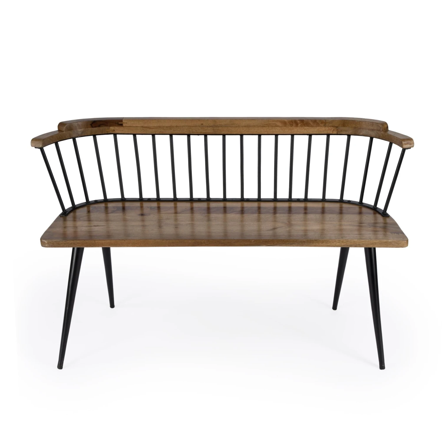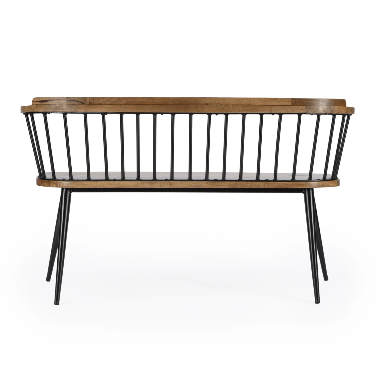 The natural variations of the brown mango wood and black Iron Frame strikes the perfect balance between modern-industrial and rustic design in this eyecatching bench. The delicate spindle back give this a clean-line silhouette that can comfortably seat two and hold up to 385lbs.