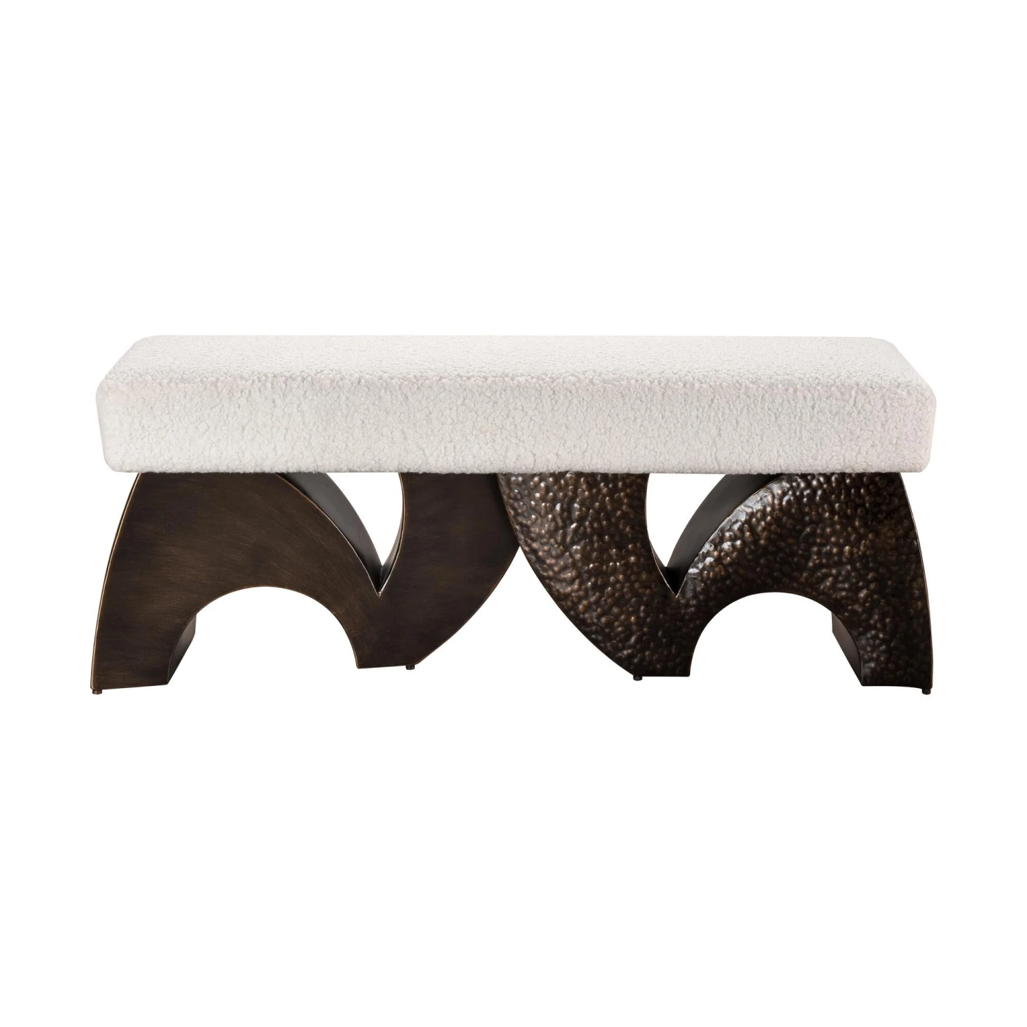 The Timber Bench is a rectangular bench upholstered in white boucl. The statement-making base is made from curved zig-zagging antiqued bronze with contrasting texture. The look is modern and stylish for an entryway or bedroom.