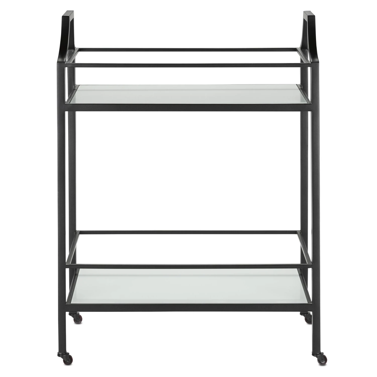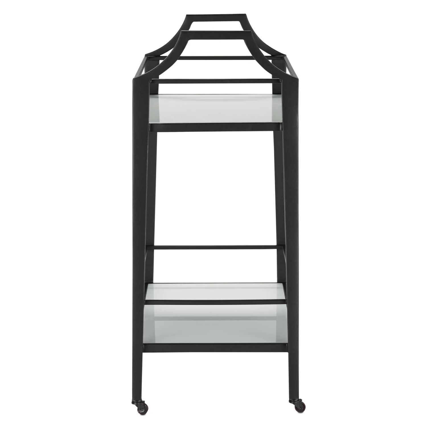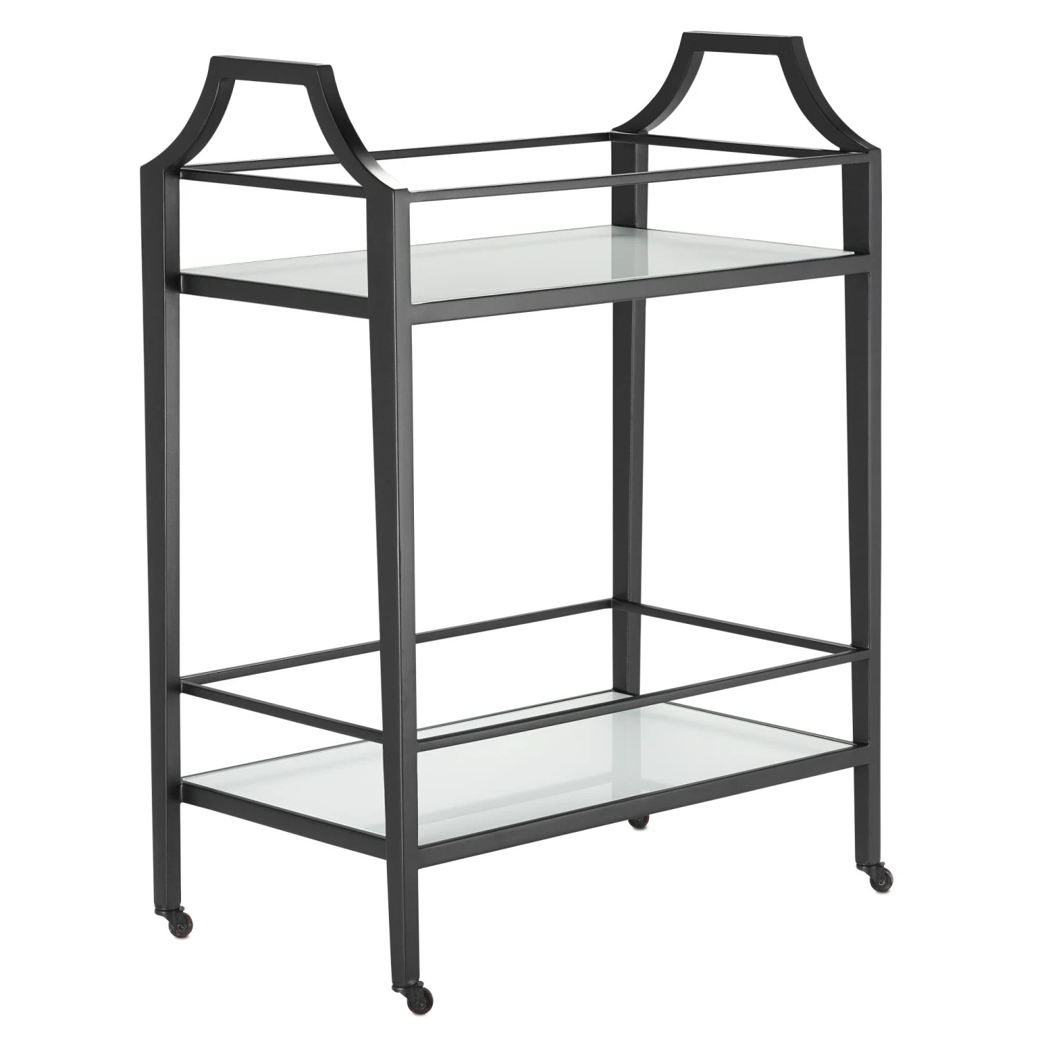 With the same clean, angular design of our Torrey benches and ottomans in silver and black, our Torrey Black Bar Cart is made of a steel frame with a black finish. Complemented by white glass shelves, the juxtaposition gives the design of this cocktail cart a refined modern look.