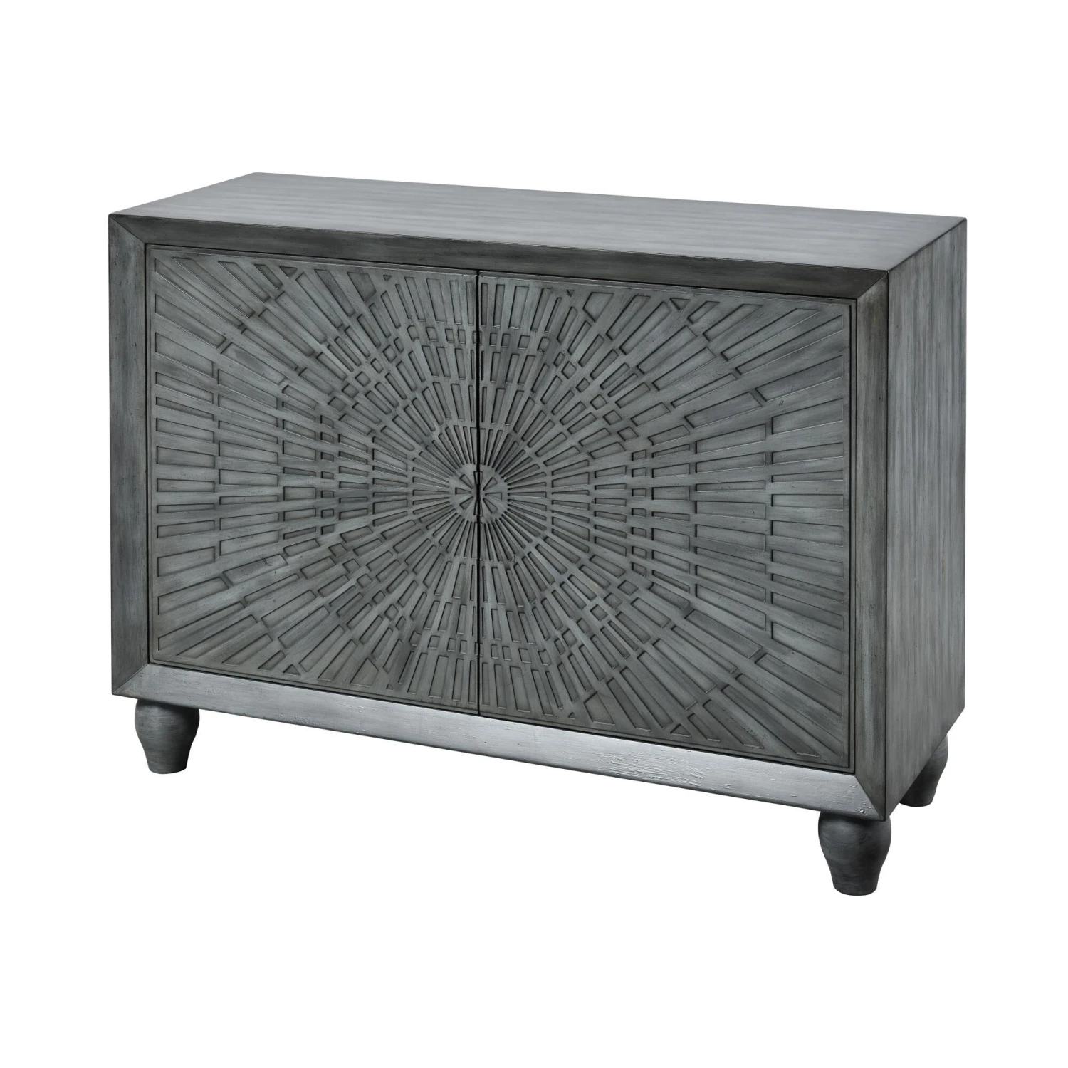 The Tuamotu Cabinet features two solid wood doors with shelving within. The door fronts feature a carved sunburst style geometric pattern emitting from the central point. A reclaimed grey painted finish gives this piece versatile appeal.