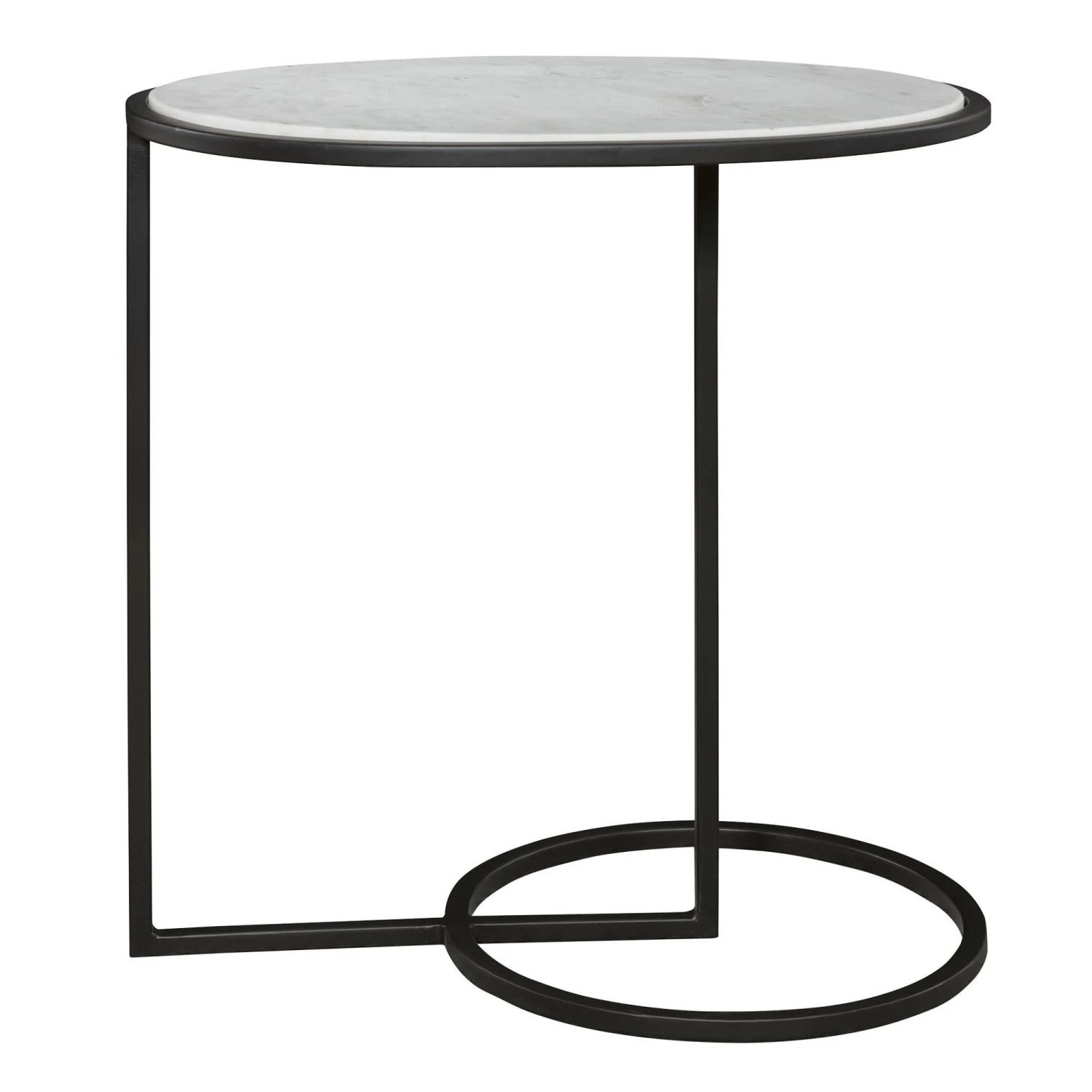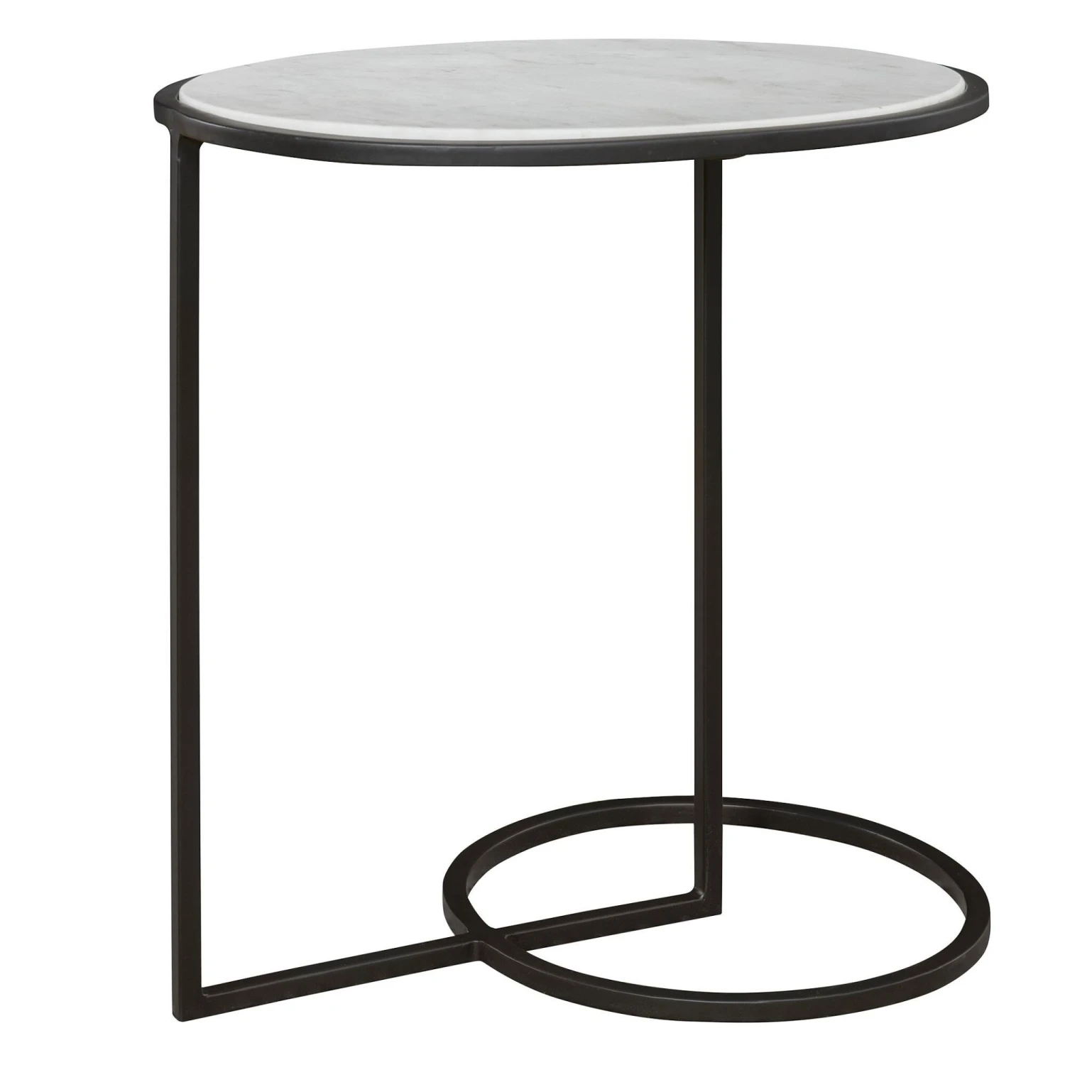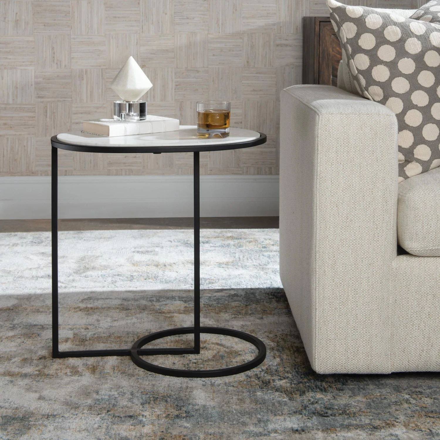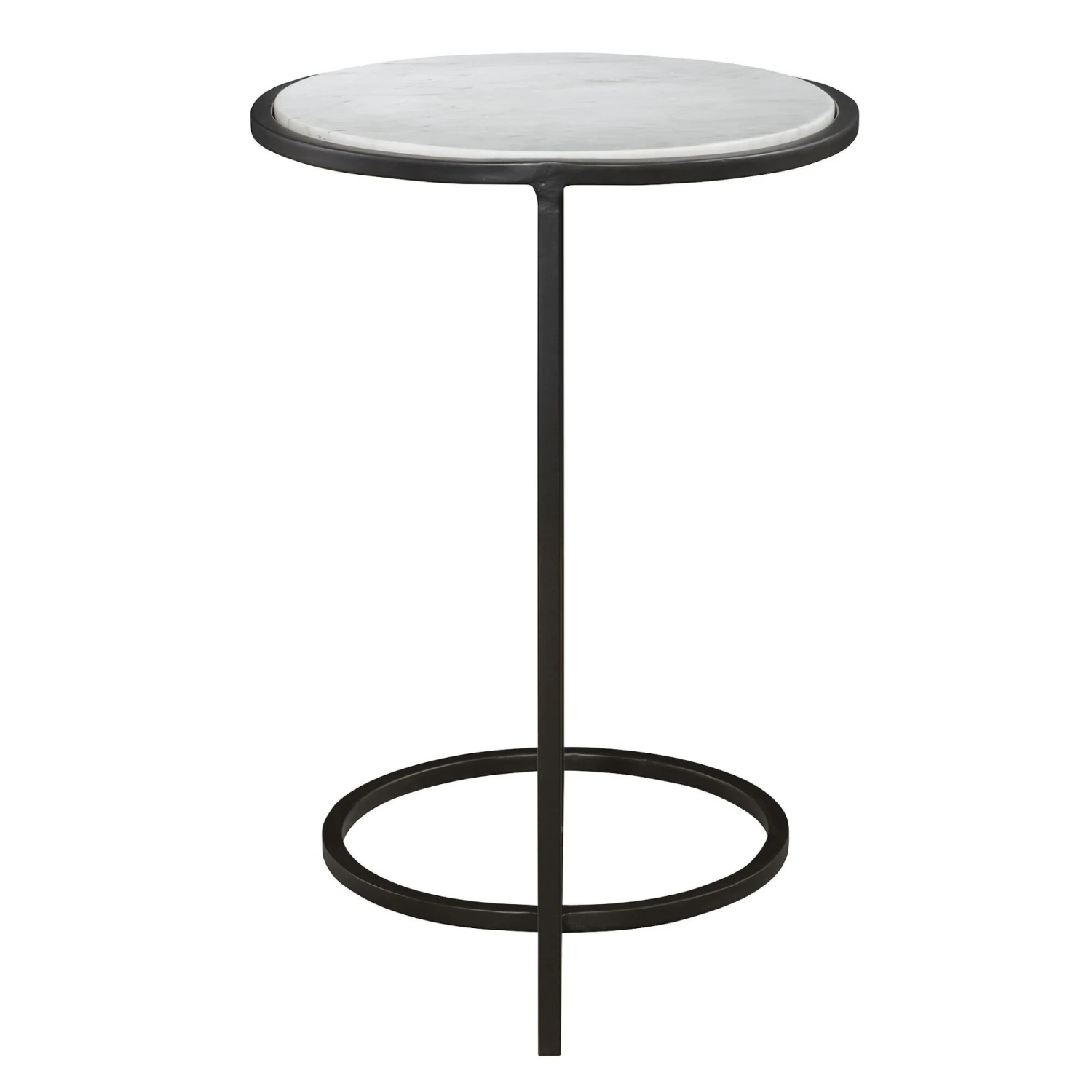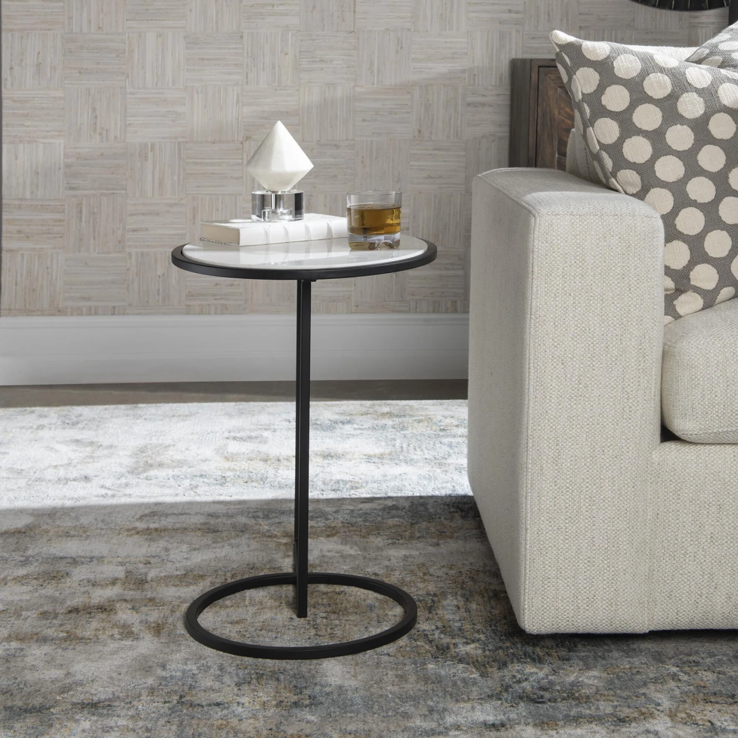 Inspired By Contemporary Designs, This Accent Table Is Crafted With A Sleek Satin Black Iron Frame Topped With A Striking Polished White Marble Stone. Because Of The Natural Characteristics Of Marble, Each Piece Will Have Unique Veining Patterns.