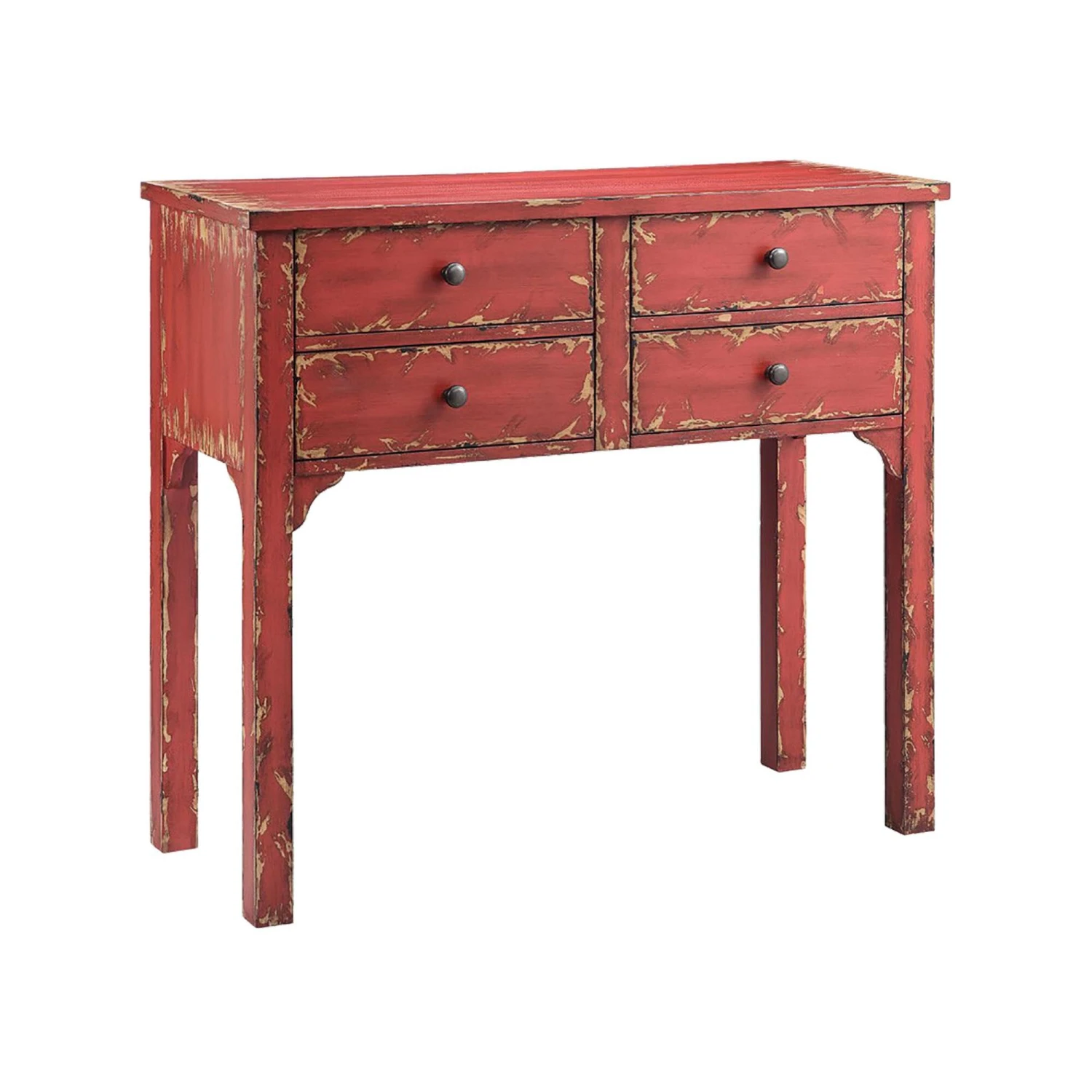 Four-drawer petite console. Hand-painted brick red finish with light brown rub. Metal button mushroom shaped hardware.